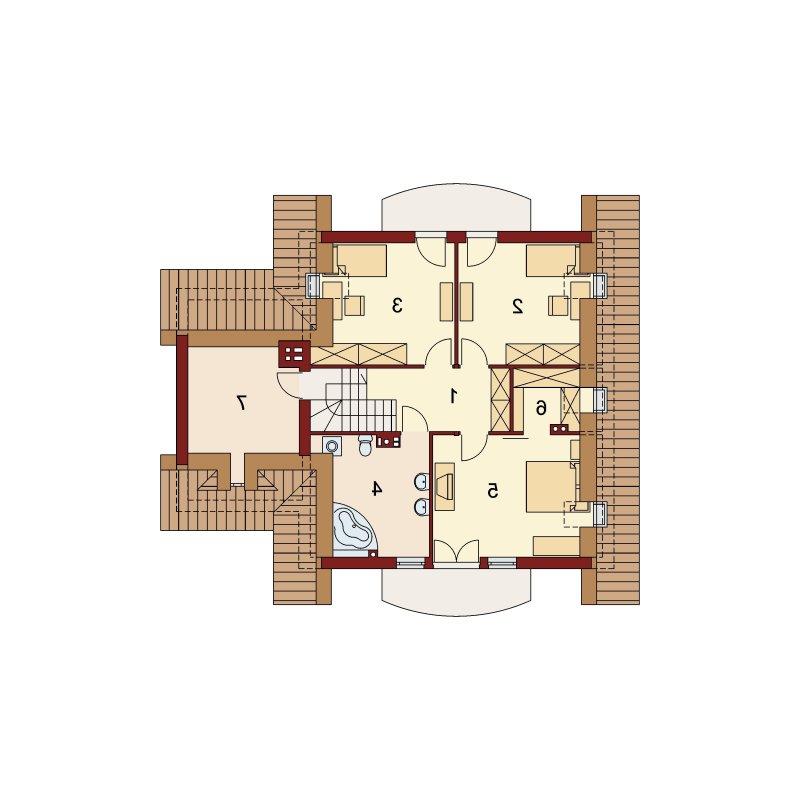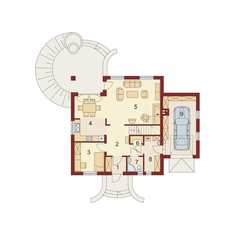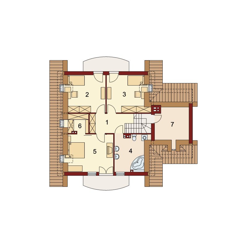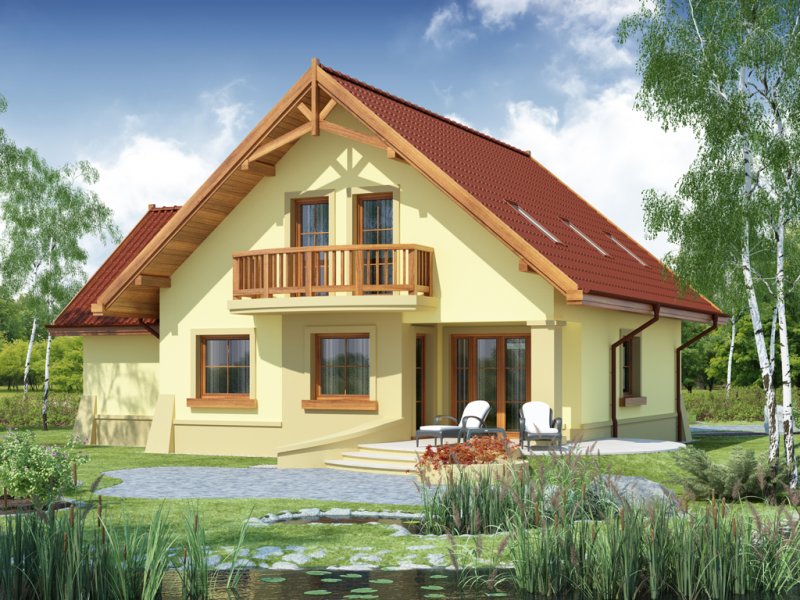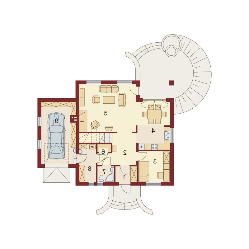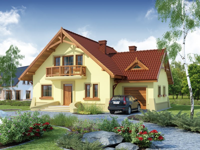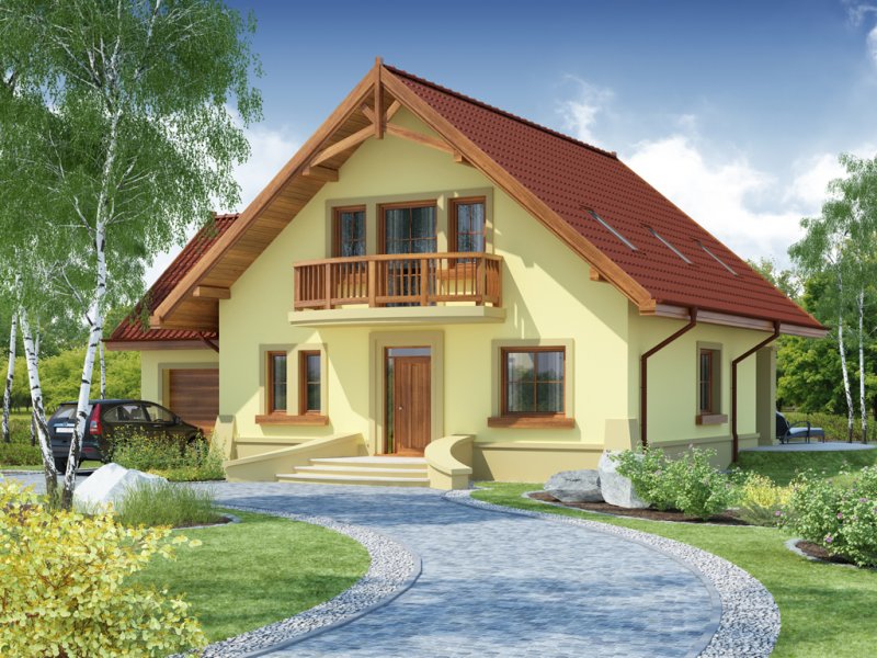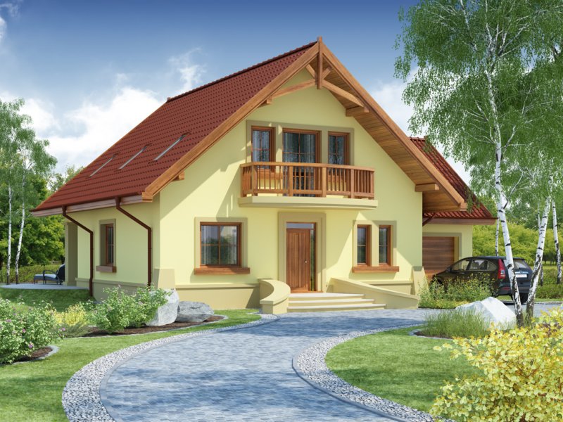 Dom z poddaszem użytkowym, przeznaczony dla 4-5-osobowej rodziny. Na parterze znajduje się przestronny pokój dzienny otwarty na jadalnię połączoną z kuchnią. Rozwiązanie funkcjonalne pozwala na wydzielenie ww. pomieszczeń. Wyjście na taras z podcieniem jest możliwe zarówno z jadalni jak i z pokoju dziennego. Na parterze znajduje się spiżarnia, łazienka oraz dodatkowy pokój, a także pomieszczenie gospodarcze, przez które można się dostać do przestronnego garażu, dającego możliwość zabudowania dwóch ścian szafami. Na poddaszu znajdują się trzy sypialnie, łazienka oraz garderoba. Hol na poddaszu posiada wnękę przeznaczoną na szafę. Nad garażem można zaadaptować strych nieużytkowy dostępny bezpośrednio z klatki schodowej na dodatkowe pomieszczenie gospodarcze lub pokój o powierzchni ponad 13 m2. W ramach adaptacji istnieje mozliwość powiększenia kuchni z jadalnią i tarasu w podcieniu oraz powiększenie i lokalizacja spiżarni bezpośrednio przy kuchni, kosztem dodatkowego pokoju na parterze. Dzięki prostym rozwiązaniom konstrukcyjnym i nieskomplikowanej bryle jest on niedrogi w budowie i eksploatacji. Projekt dostępny w lustrzanym odbiciu oraz w wersji z garażem dwustanowiskowym.