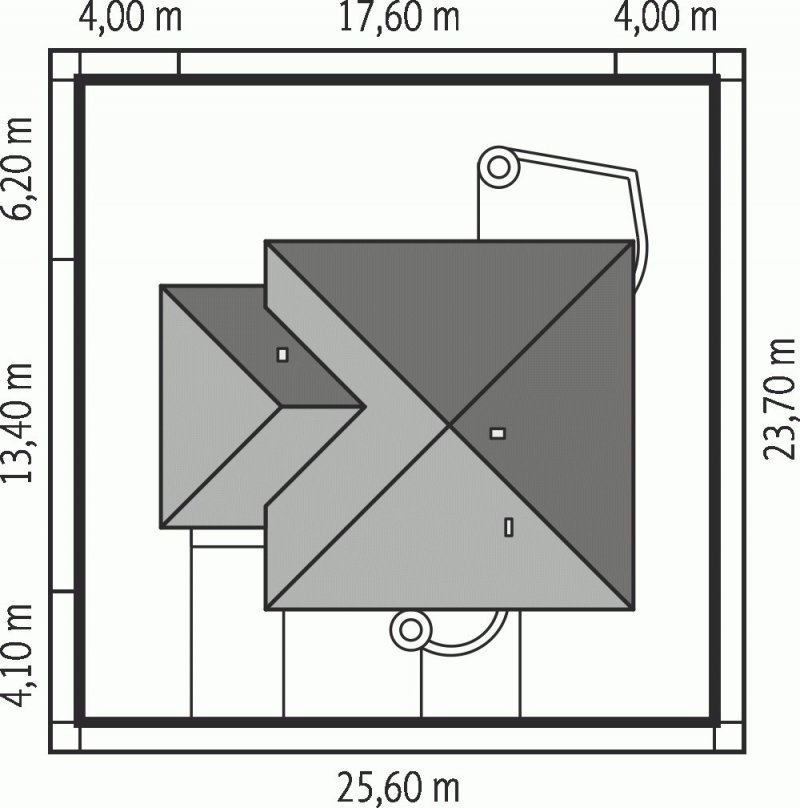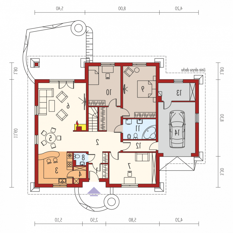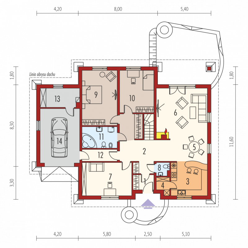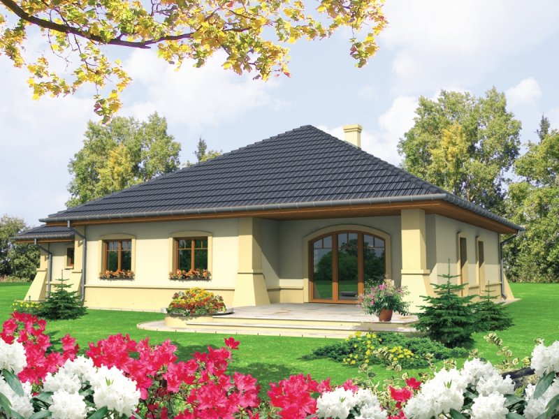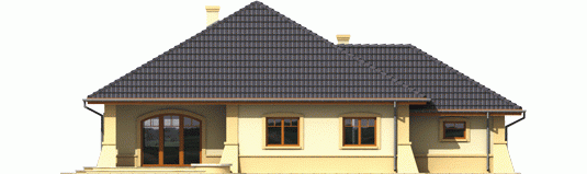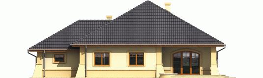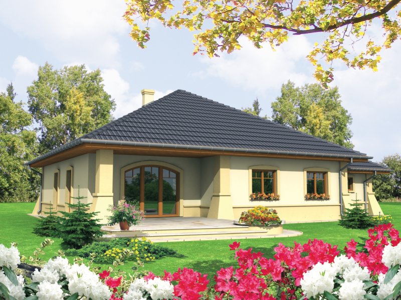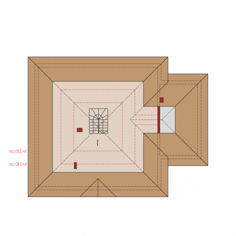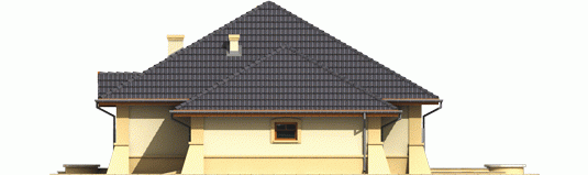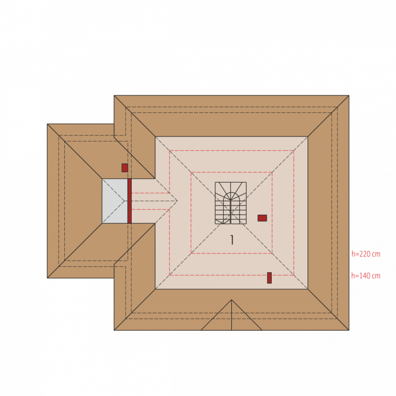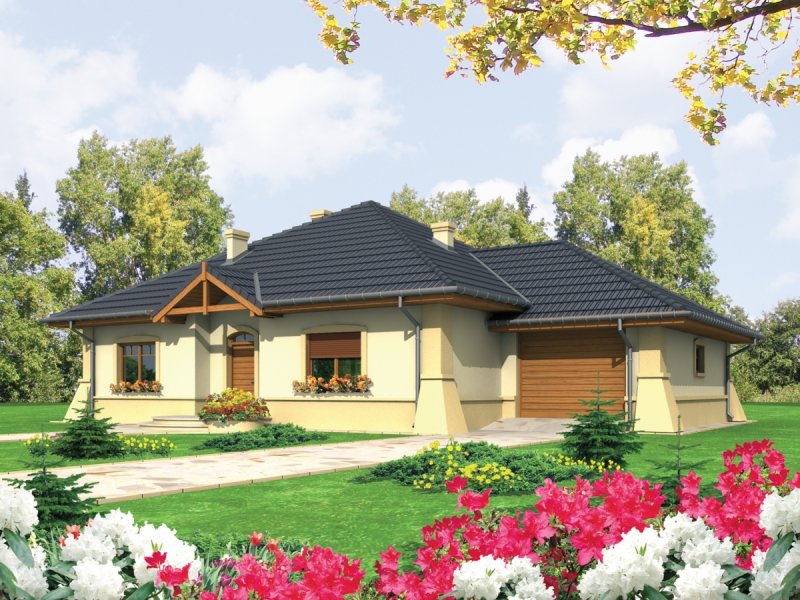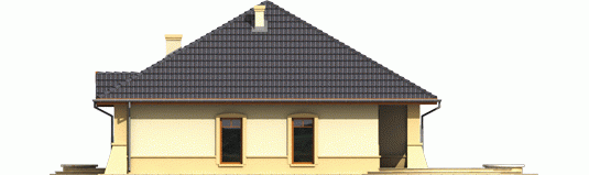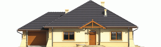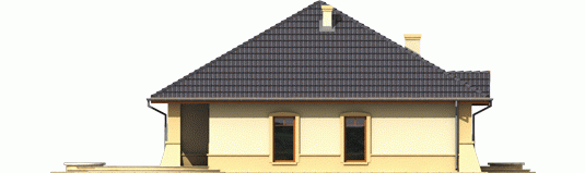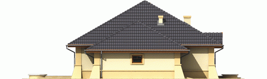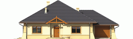 Dom parterowy z poddaszem do późniejszej adaptacji, niepodpiwniczony, z garażem jednostanowiskowym, przeznaczony dla 3-5-osobowej rodziny. Część dzienną i nocną zaplanowano na parterze, ale prosty i czytelny układ domu pozwala doskonale te strefy wyodrębnić. Strefa dzienna to otwarta przestrzeń oraz gabinet, natomiast nocna to dwie wydzielone sypialnie, garderoba i łazienka. Gabinet może funkcjonować jako dodatkowa sypialnia lub pokój dla gości. Na poddaszu znajduje się obszerny strych, który można zaadaptować na dodatkowe pokoje. Istnieje wersja tego projektu bez garażu.