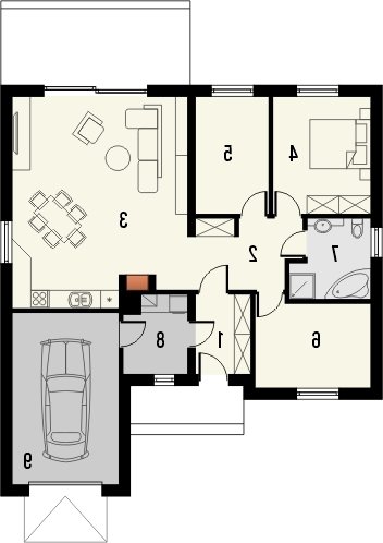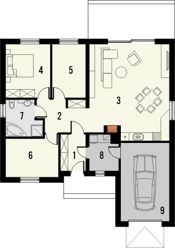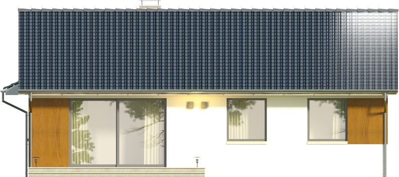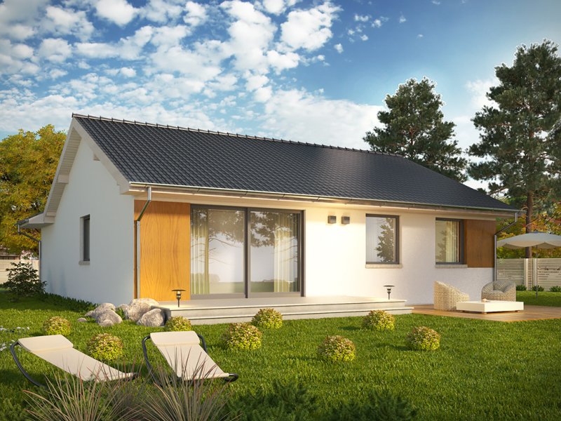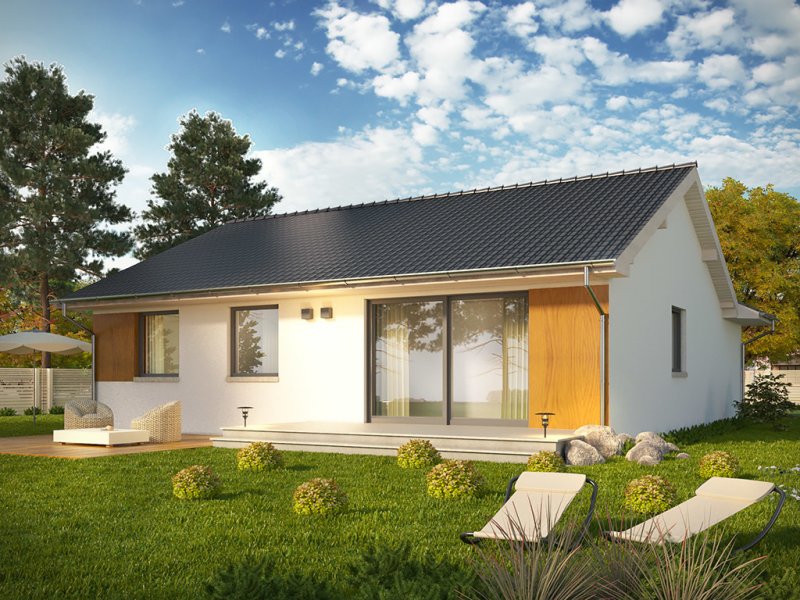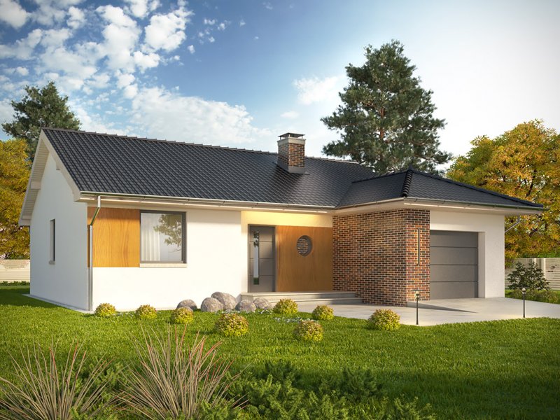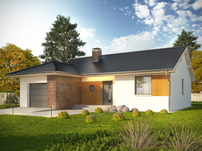 Juka to ciekawy domek parterowy, niewielki, jednak w pełni funkcjonalny. Dostępny jest w wersji z jednostanowiskowym garażem, połączonym z wiatrołapem poprzez pomieszczenie gospodarcze. Salon posiada wydzieloną jadalnię, połączony jest z w pełni otwartą kuchnią. Ponadto projekt przewiduje 3 pokoje sypialne i łazienkę. Prostą i ekonomiczną bryłę domu urozmaica garaż, który jest nieznacznie wysunięty względem pozostałej części budynku. Jest on częściowo obłożony płytką klinkierową. Dodatkowym urozmaiceniem jest okładzina drewniana, która pojawia się w sąsiedztwie otworów okiennych. Duże okna są funkcjonalne, a zarazem pozwalają na dobry kontakt z ogrodem.Materiały, z których wykonać można dom, to gazobeton + styropian (ściany), tynk, okładzina klinkierowa i drewniana (wykończenie ścian). Sufit podwieszony jest do drewnianej więźby dachowej, dach kryty jest dachówką ceramiczną. Na etapie adaptacji wprowadzić można inne materiały. Projekt dostępny jest w wariantach standard i odbicie lustrzane.