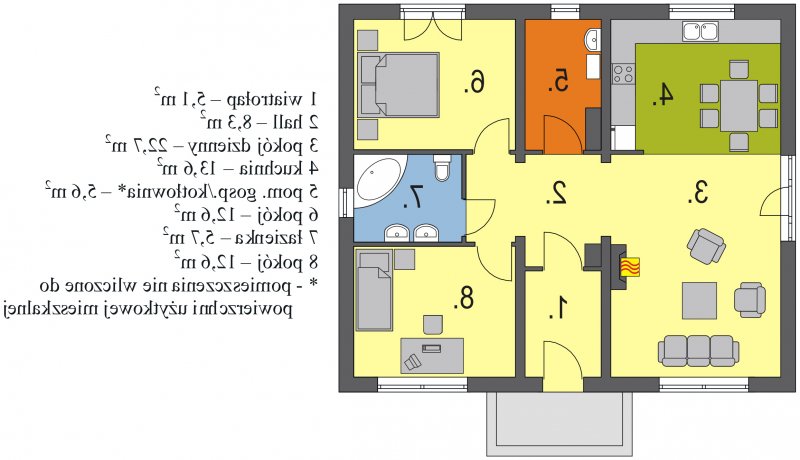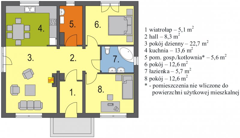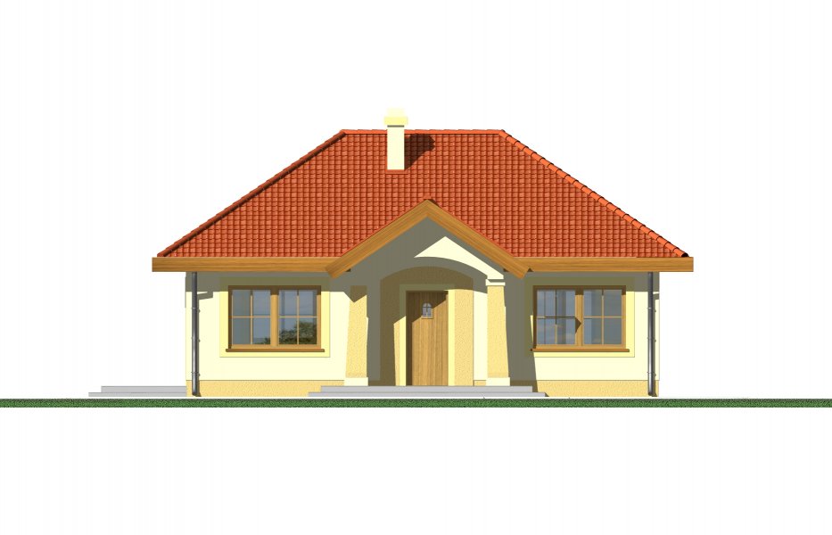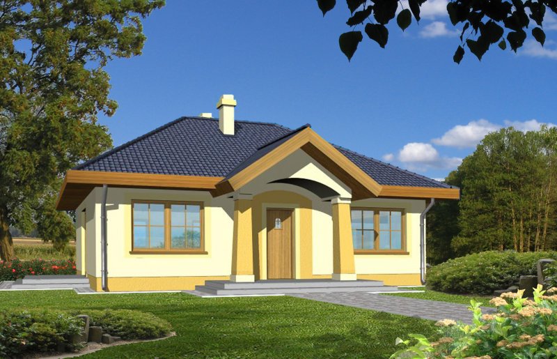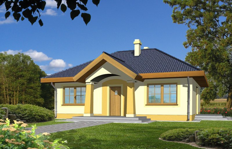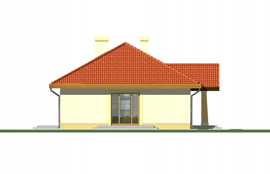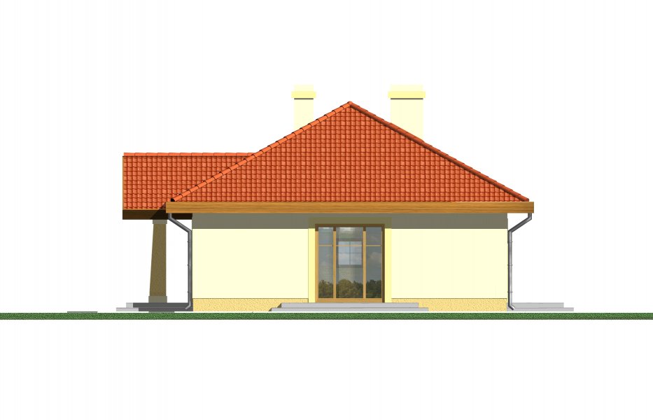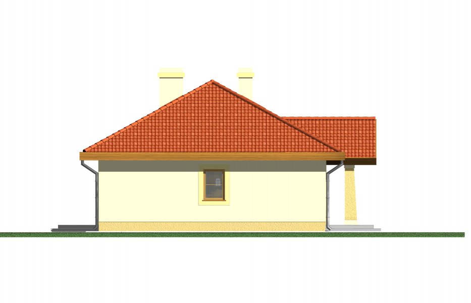 Mały parterowy niepodpiwniczony domek, o prostej bryle. Strefa dzienna to przestrzeń gdzie kuchnia połączona jest z jadalnią i pokojem dziennym, w której będziemy spędzać większość czasu. Dwie sypialnie przedzielone łazienką są miejscem odpoczynku gospodarzy domu. Dostępna wersja z garażem i w lustrzanym odbiciu