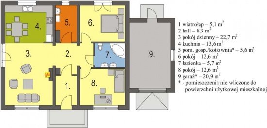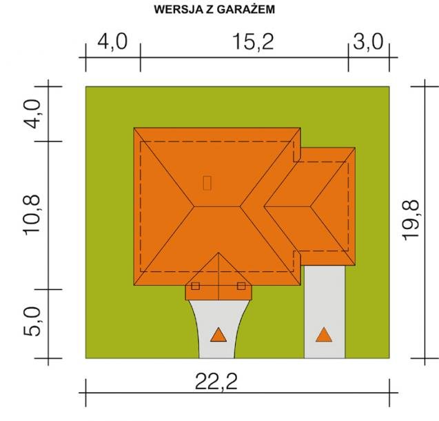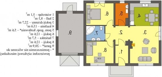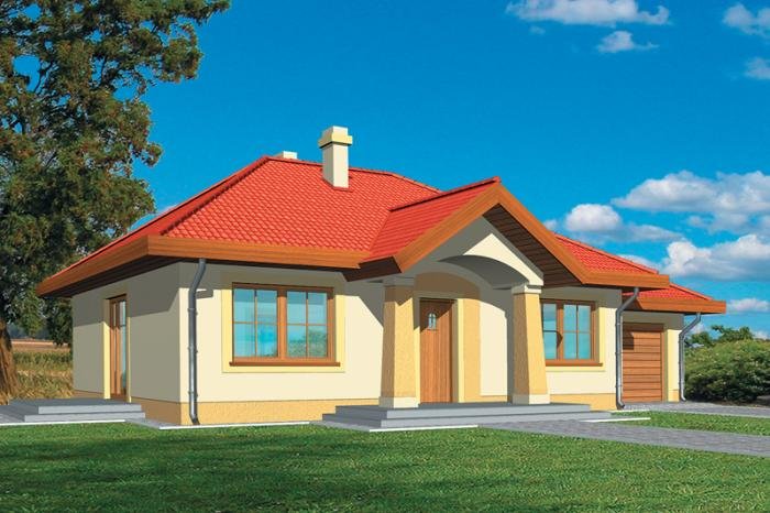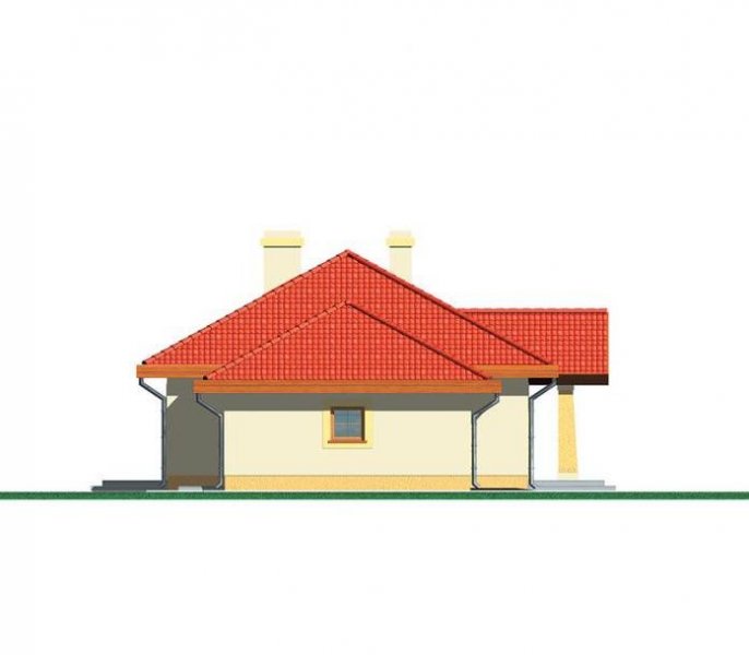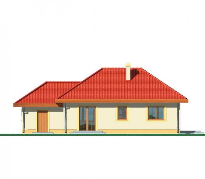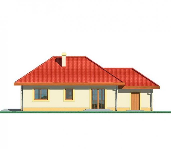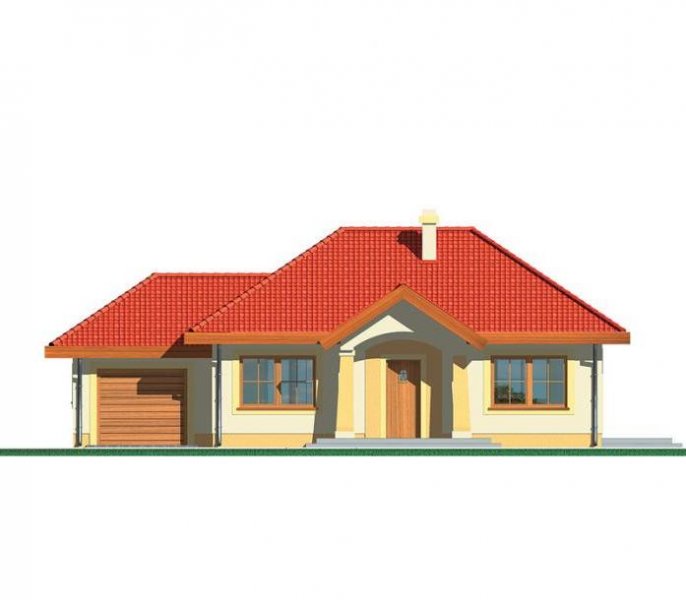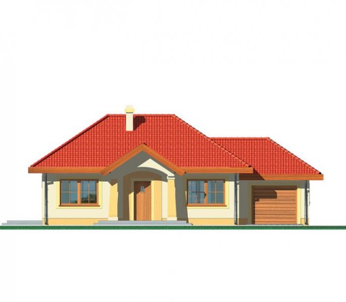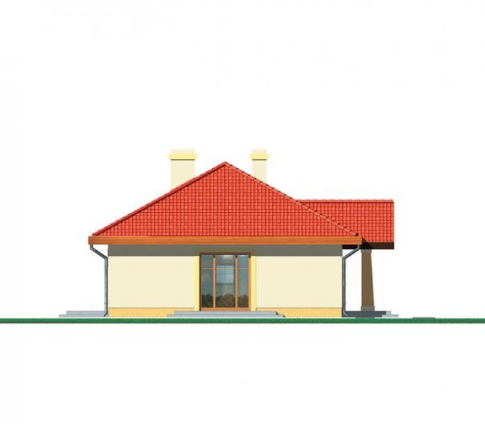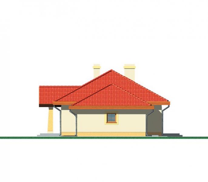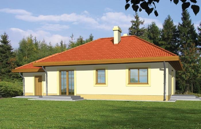Mały parterowy niepodpiwniczony domek, o prostej bryle. Większość czasu będziemy spędzać w strefie dziennej, gdzie kuchnia połączona jest z jadalnią i pokojem dziennym. Dwie sypialnie przedzielone łazienką są miejscem odpoczynku gospodarzy domu. Dostępna wersja bez garażu i w lustrzanym odbiciu.