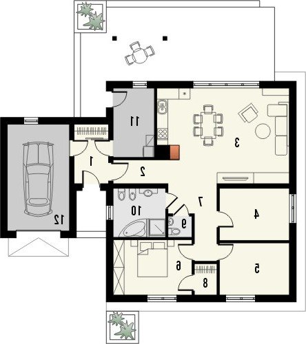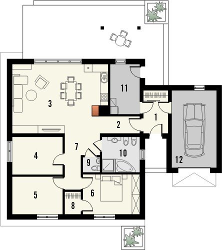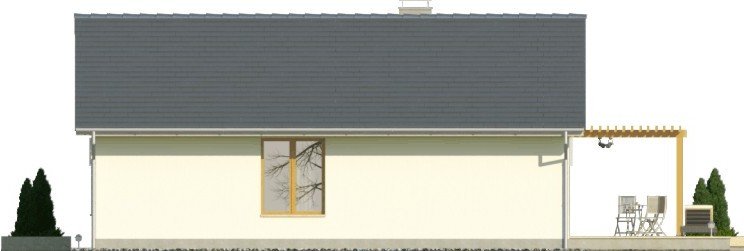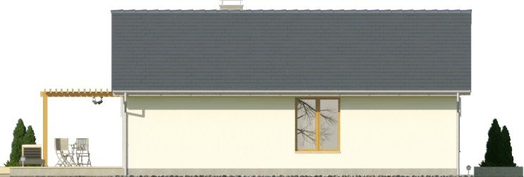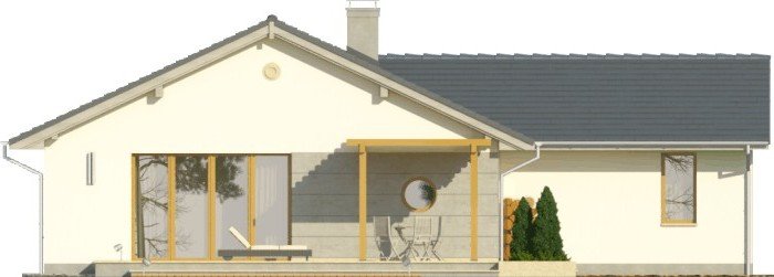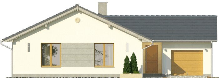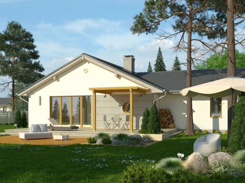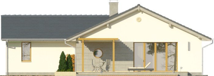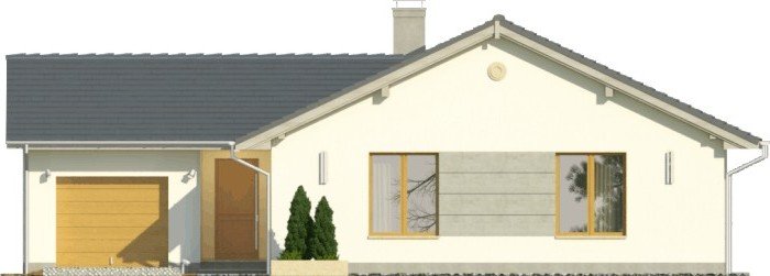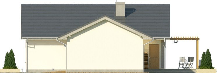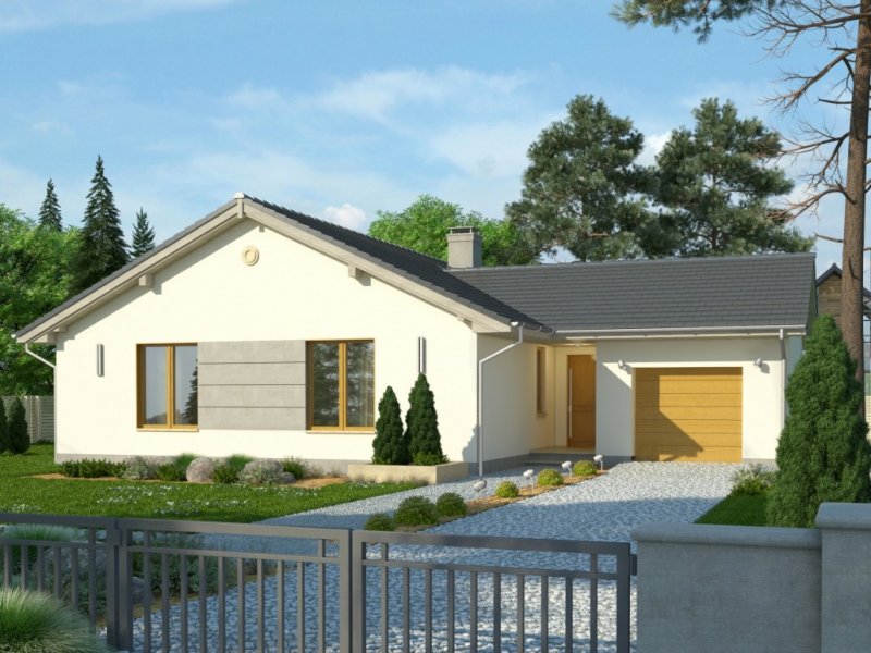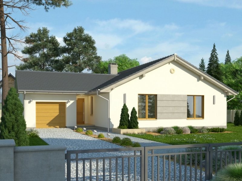 Projekt domu jednorodzinnego z garażem jednostanowiskowym. Powierzchnię parteru zajmuje strefa dzienna: przestronny salon oraz otwarta kuchnia, a także wc, łazienka, 3 pokoje, pomieszczenie gospodarcze i wiatrołap z miejscem na szafę. Dokumentacja w sprzedaży także w wersji lustrzanej.Dom o nieskomplikowanej bryle pokryty dachem dwuspadowym. Jasna elewacja oraz kamienne elementy nadają mu nowoczesnego wyglądu. Drewniana pergola na tarasie to doskonałe miejsce na wspólne posiłki w słoneczne dni.