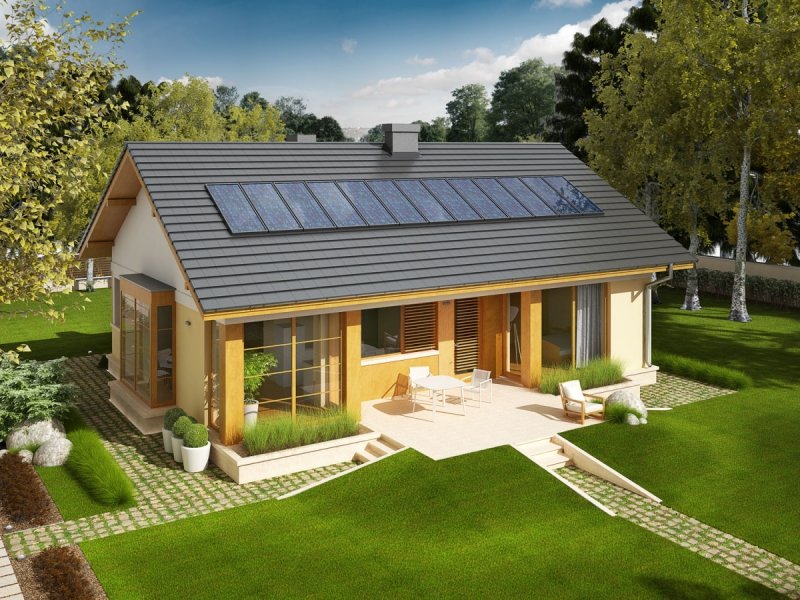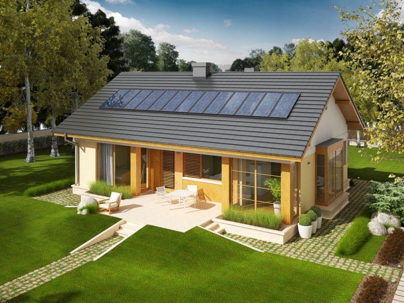 Dom zaprojektowany w technologii murowej ze stropem gęstożebrowym. Dach o konstrukcji drewnianej pokryty dachówką płaską lub inną o podobnych parametrach. Więźba dachowa dostępna również w systemie prefabrykacji drewnianej. Elewacje wykończono tynkiem mineralnym, okładziną drewnianą. Cokół kamienny. Stolarka okienna drewniana lub PCV.