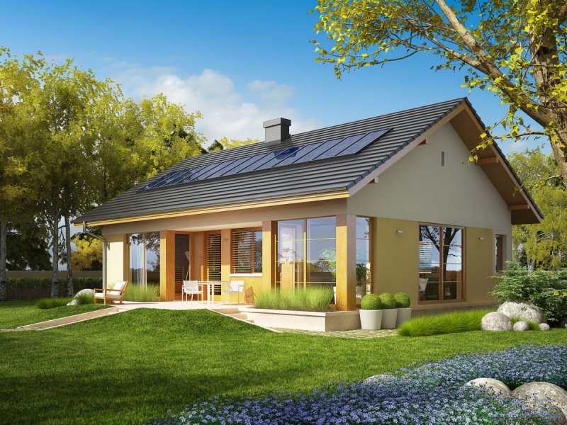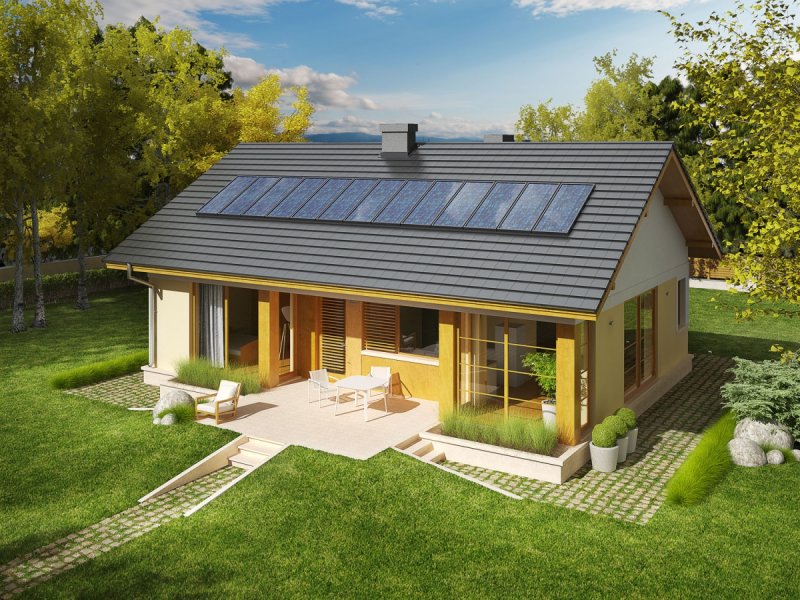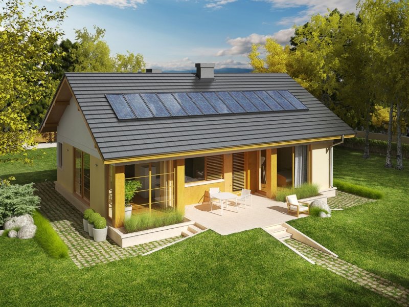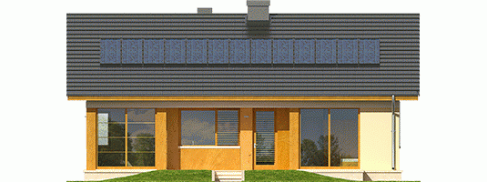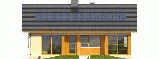 Dom zaprojektowany w technologii murowej ze stropem gęstożebrowym. Dach o konstrukcji drewnianej pokryty dachówką płaską lub inną o podobnych parametrach. Więźba dachowa dostępna również w systemie prefabrykacji drewnianej. Elewacje wykończono tynkiem mineralnym, okładziną drewnianą. Cokół kamienny. Stolarka okienna drewniana lub PCV.