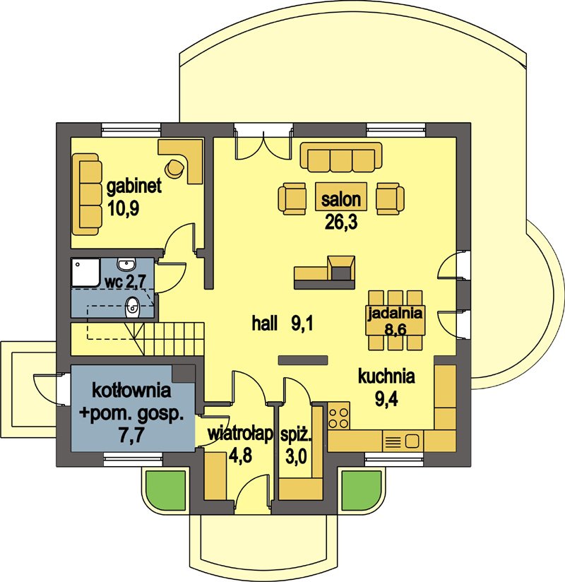 Na parterze znajduje się wiatrołap, kotłownia z pomieszczeniem gospodarczym, hall, jadalnia, salon kominkowy, kuchnia ze spiżarnią, wc i gabinet , który może pełnić rolę pokoju gościnnego. Z salonu i jadalni można dostać się na duży, częściowo zadaszony taras ogrodowy. Na poddaszu znajdują się trzy wygodne sypialnie, w tym dwie z własnymi garderobami, komunikacja i duża łazienka.