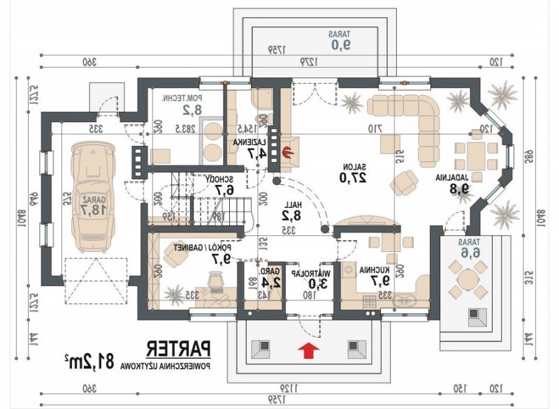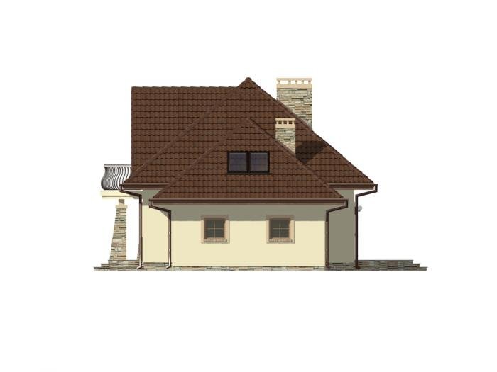* Na parterze zaprojektowano reprezentacyjny otwarty salon z kominkiem połączony z aneksem jadalnym w wykuszu, kuchnię, pokój (gabinet), łazienkę, garderobę oraz garaż, wiatrołap i kotłownię