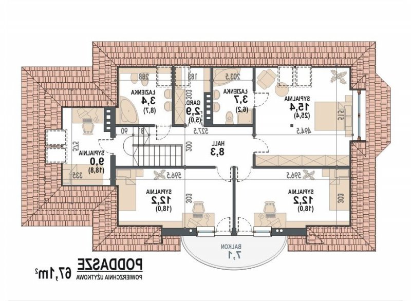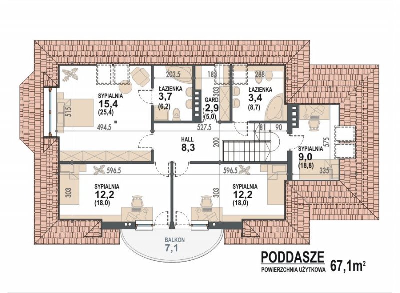 * Na poddaszu zaprojektowano 3 sypialnie (sypialnia rodziców z własną łazienką), pokój rekreacyjny, który można zaaranżować jako dodatkową sypialnię oraz ogólnodostępną łazienkę i garderobę.