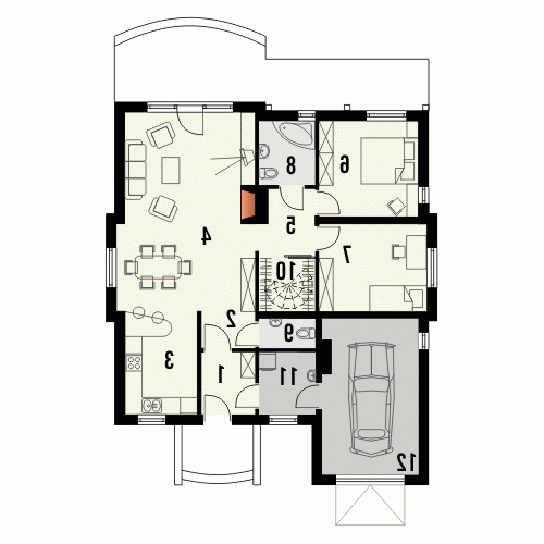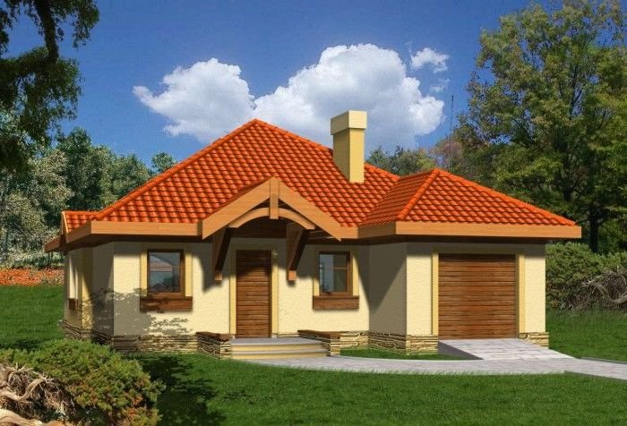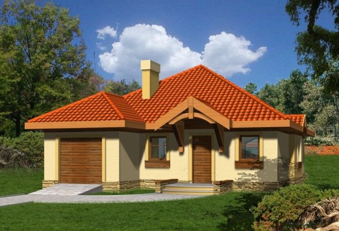 Budynek niepodpiwniczony parterowy z wbudowanym garażem jednostanowiskowym. Zachowany funkcjonalny podział wnętrza na strefę dzienną i nocną. Część dzienną zajmuje kuchnia, wc oraz salon z aneksem jadalnym i wyjściem na taras oraz kominkiem. 2 sypialnie dostępne z osobnego korytarza wyposażone są w przestronną łazienkę oraz garderobę. Możliwa adaptacja poddasza o powierzchni 23m2. Dokumentacja dostępna również w odbiciu lustrzanym.