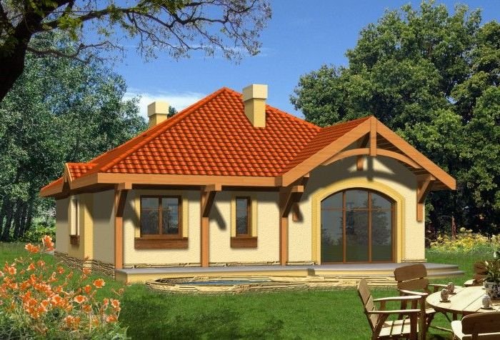 Ściany budynku zaprojektowano z betonu komórkowego z dociepleniem lub w innej technologii w ramach adaptacji. Strop i więźba drewniana, pokrycie dachówką ceramiczną lub cementową. Elewacje tynkowane, cokół okładany kamieniem naturalnym (lub klinkierem), ozdobne elementy fasad z drewna.