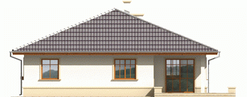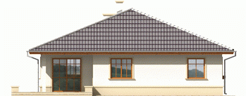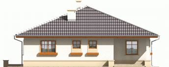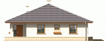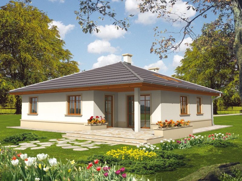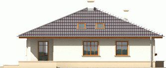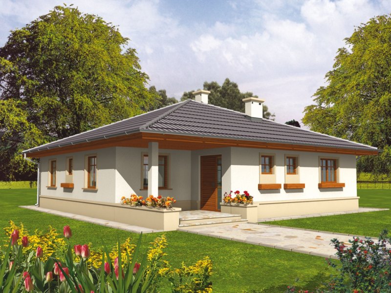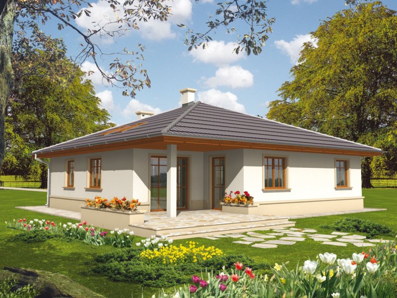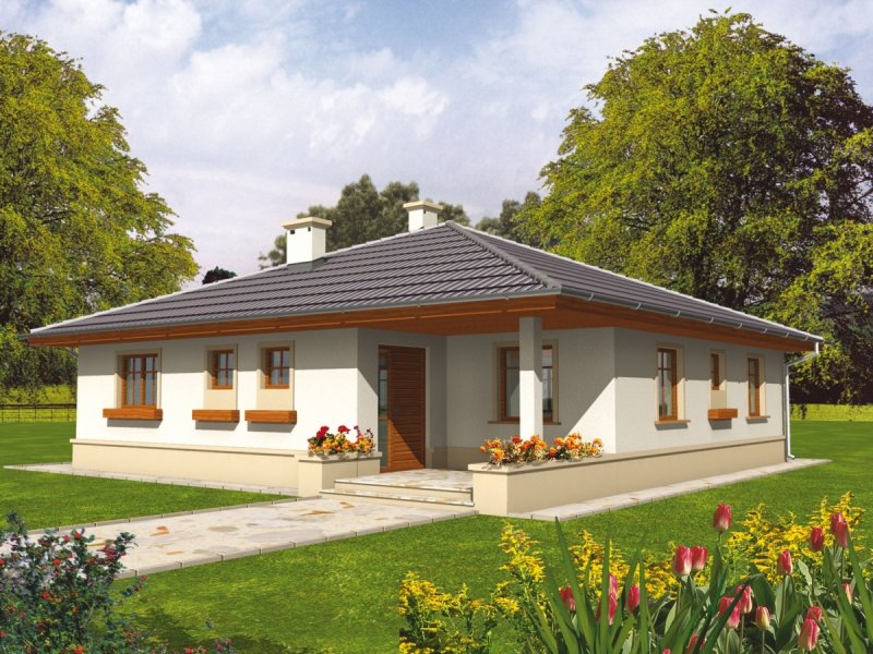 Dom parterowy, niepodpiwniczony, przeznaczony dla 3-osobowej rodziny. Ciekawie i funkcjonalnie zaaranżowane wnętrze przy jednocześnie prostej bryle jest wyraźnie podzielone na strefę dzienną i nocną. Dwie spore sypialnie, łazienka i wygodna garderoba to część nocna, natomiast dzienna odkrywa przed nami salon wraz z otwartą nań kuchnią. Dodatkową zaletą salonu jest doświetlenie oknami połaciowymi. Na uwagę zasługują interesujące podcienie usytuowane przy frontowym wejściu oraz od strony ogrodu. Są one praktyczne pod względem użytkowym i uatrakcyjniają bryłę budynku. Mimo że jest on utrzymany w charakterze domu tradycyjnego, doskonale wpasowuje się w tkankę miejską.