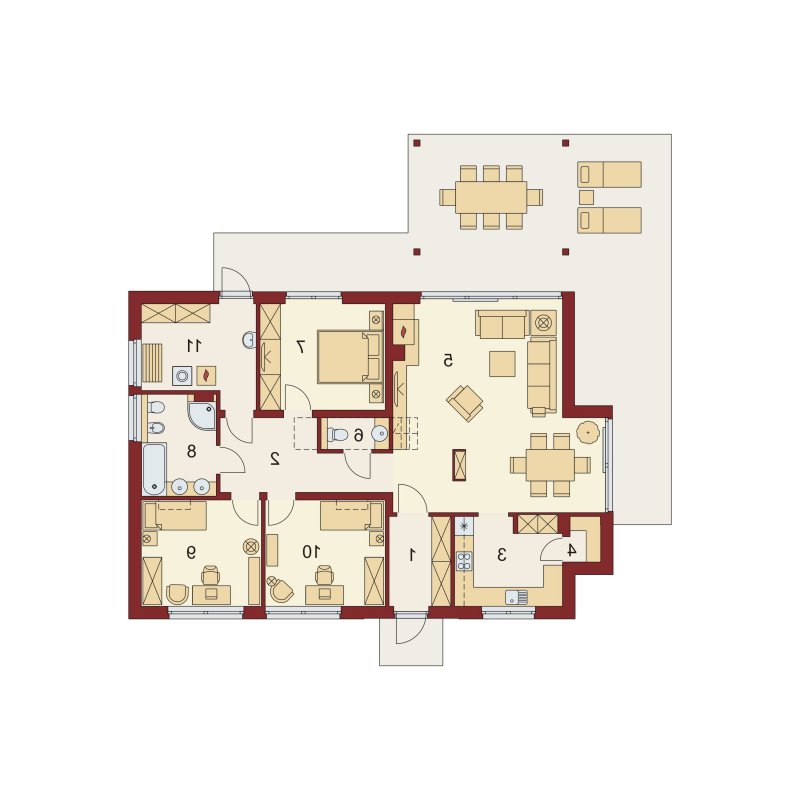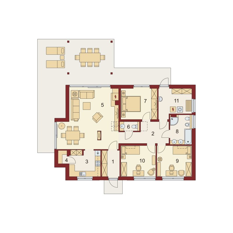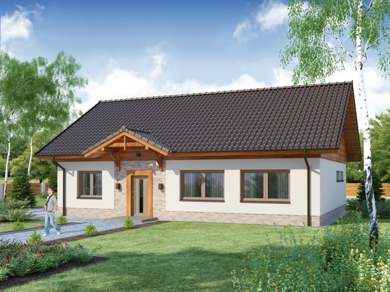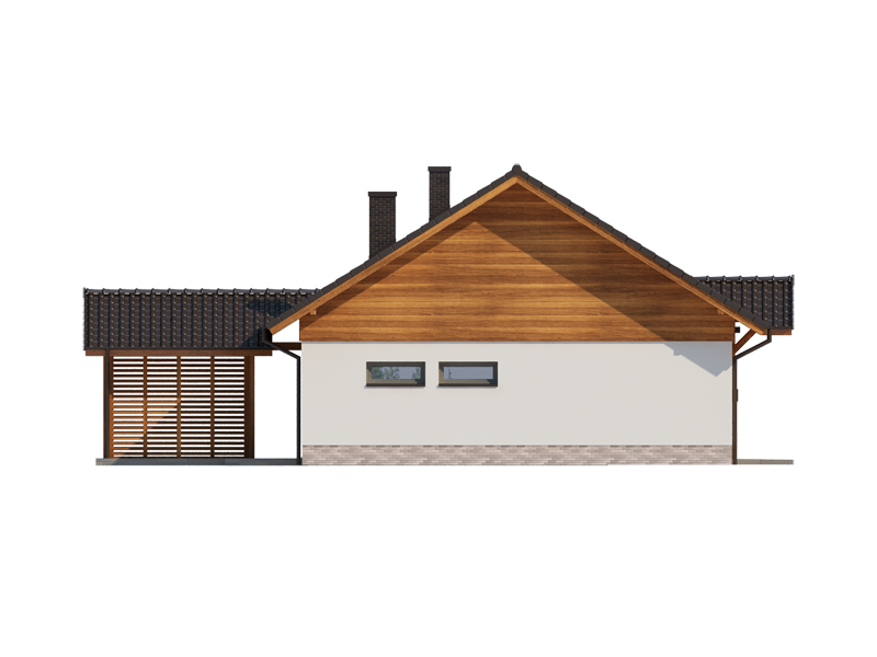LENA 3 PS została zaprojektowana dla 4-osobowej rodziny. Przez wygodny przedsionek z miejscem na szafę, wchodzimy do przestronnego salonu połączonego z jadalnią. Okazała kuchnia ze spiżarnią jest od nich oddzielona, ale z łatwością można ją połączyć z resztą strefy dziennej. Przy przejściu do zacisznej części nocnej znajduje się dogodnie umiejscowiona toaleta, za którą znajdują się trzy obszerne sypialnie, bogato wyposażona łazienka, oraz duże pomieszczenie gospodarcze z praktycznym wyjściem do ogrodu.