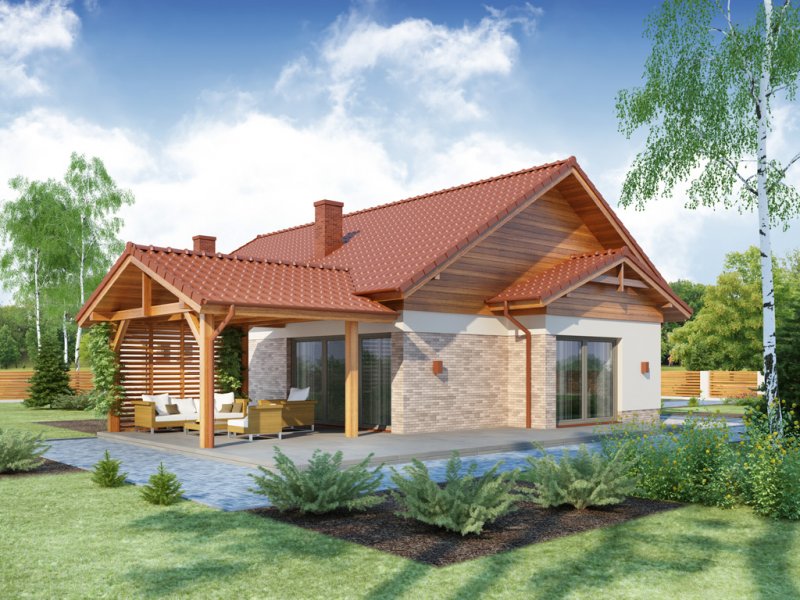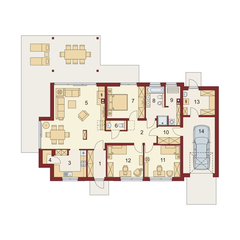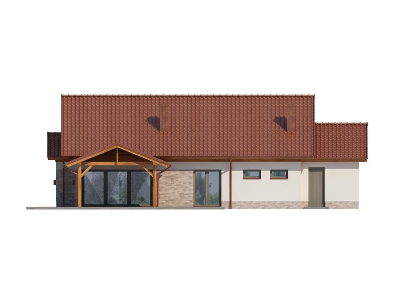 LENA została zaprojektowana dla 4-osobowej rodziny. Przez wygodny przedsionek z miejscem na szafę, wchodzimy do przestronnego salonu połączonego z jadalnią. Okazała kuchnia ze spiżarnią jest od nich oddzielona, ale z łatwością można ją połączyć z resztą strefy dziennej. Przy przejściu do zacisznej części nocnej znajduje się dogodnie umiejscowiona toaleta, za którą znajdują się trzy obszerne sypialnie. Układ funkcjonalny dopełnia bogato wyposażona łazienka wraz z dostępnym z niej pomieszczeniem pralni, praktyczne pomieszczenie gospodarcze, łączące dom z garażem, oraz obszerna kotłownia z praktycznym wyjściem do ogrodu.