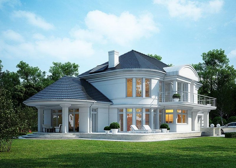- Elewacje: wykończone tynkiem silikonowym, cokół obłożony elewacyjnymi płytkami kamiennymi