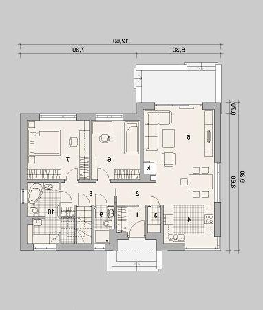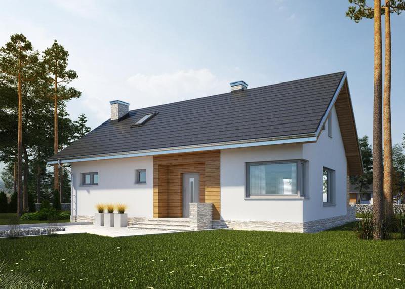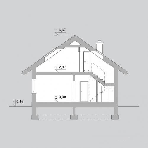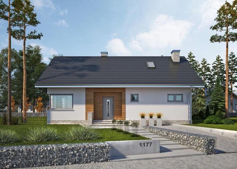 LK&1177 to projekt niewielkiego domu jednorodzinnego parterowego ze strychem. Ponieważ cała przestrzeń funkcjonalna domu jest ulokowana na jednej kondygnacji, projekt ten to doskonała propozycja dla rodzin z małymi dziećmi oraz dla osób starszych. Dom skałada się z pokoju dziennego z jadalnią, otwartej kuchni usytuowanej w bezposrdnim sąsiedztwie, niewielkiej, ale bardzo funkcjonalnej spiżarni, 2 sypialni, łazienki oraz łazienki z pralnią i kotłownią. Niewątpliwym atutem projektu jest również niewysoki koszt realizacji oraz użytkowania.