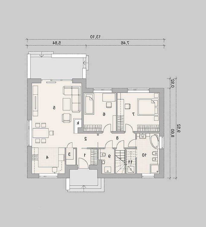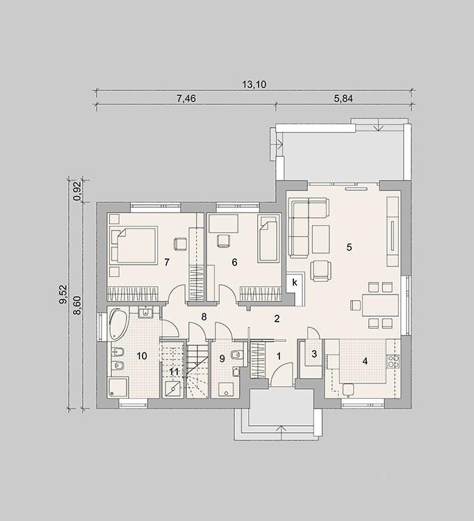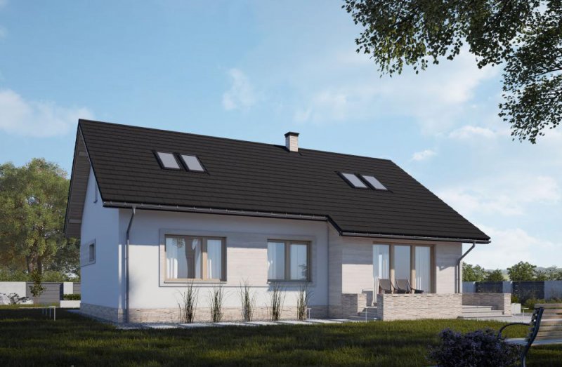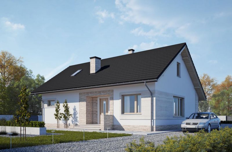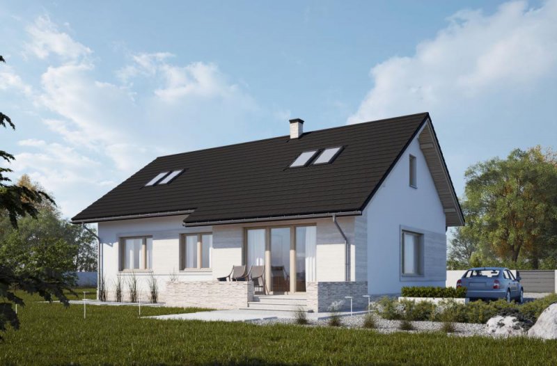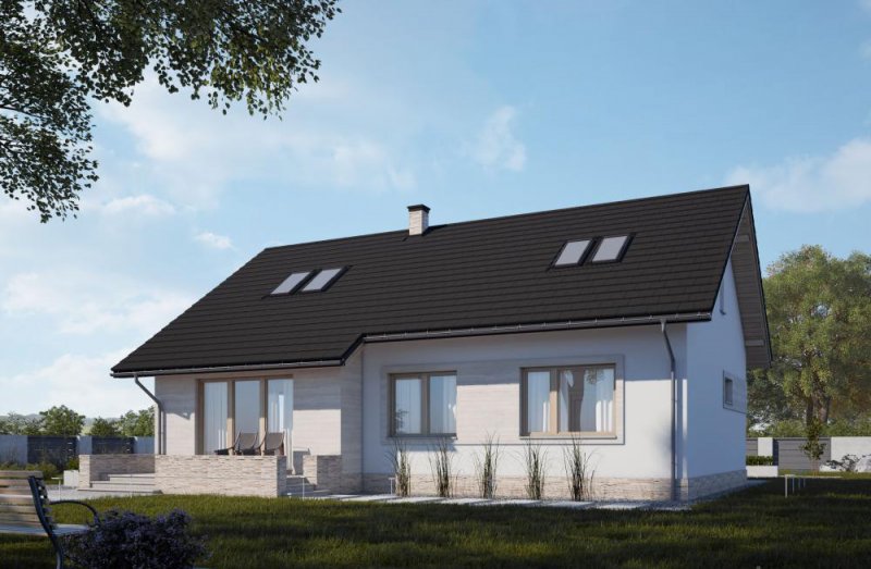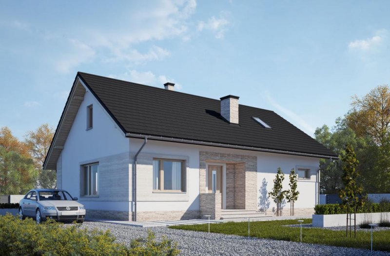 Dom parterowy, niepodpiwniczony, przeznaczony dla 3-4-osobowej rodziny. Strefę dzienną tworzy salon z obszerną jadalnią oraz kuchnia. Dodatkowo dom posiada praktyczne pomieszczenie gospodarcze oraz kotłownię. Poddasze jest możliwe do adaptacji. Strefa nocna to dwie sypialnie oraz duża łazienka połączona z pralnią. Jasna, ciepła elewacja wykończona beżowym kamieniem wygląda bardzo stylowo. LK&1273 to dom ekonomiczny w realizacji i późniejszej eksploatacji, który doskonale wpisze się w każdy krajobraz.