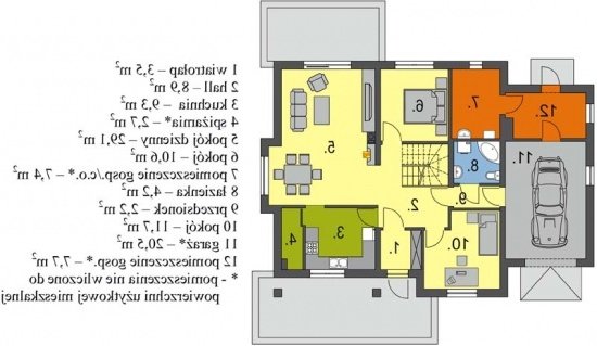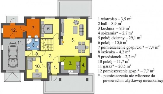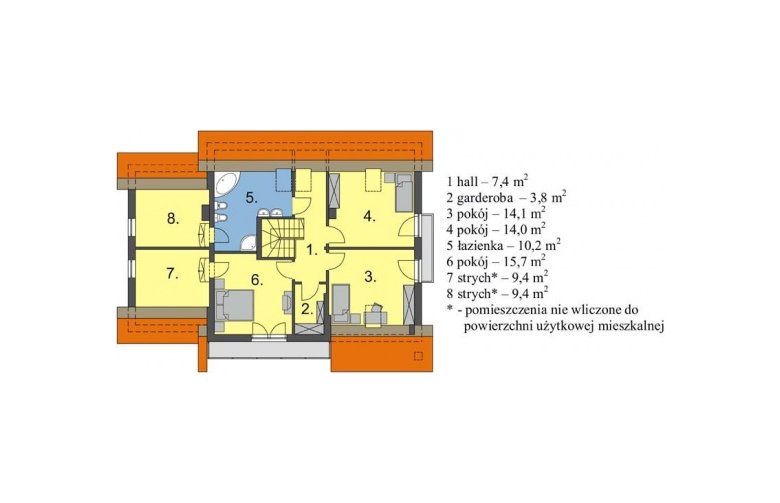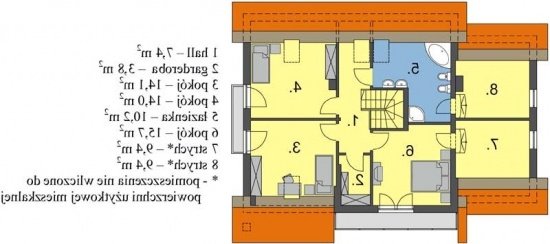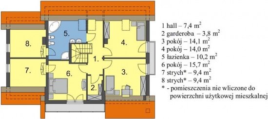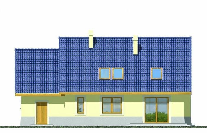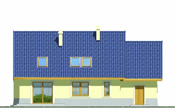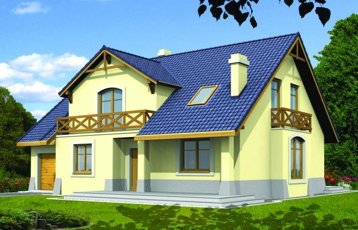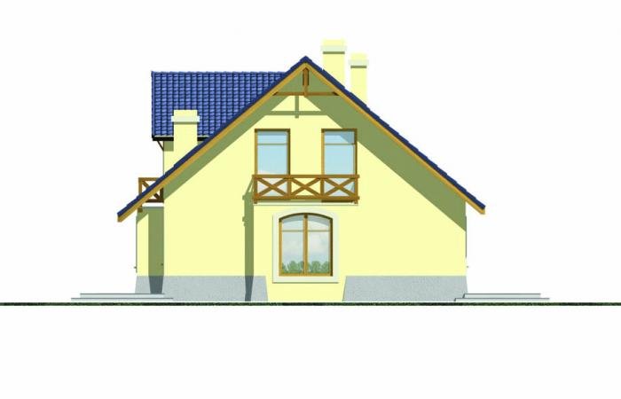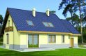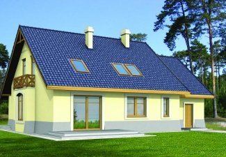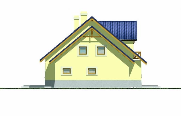 Wygodny dom o prostej konstrukcji przeznaczony dla 4-6 osobowej rodziny. Duży salon z kominkiem, kuchnia ze spiżarnią, pokoje gościnne i łazienka tworzą zgrabną część mieszkalną parteru. Bardzo przydatne będzie duże pomieszczenie gospodarcze za garażem z dostępem do kotłowni. Na poddaszu są trzy wygodne sypialnie z łazienką. Można również zaadptować pomieszczenia strychowe. Domek można zestawiać w bliźniaka, możliwa wersja bez garażu lub z garażem dwustanowiskowym.