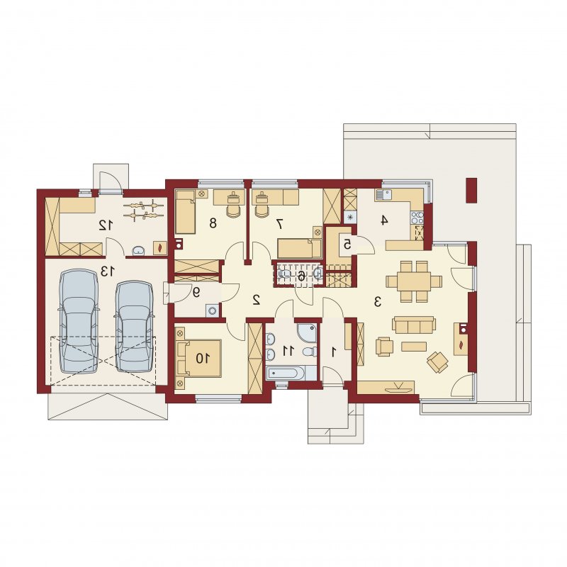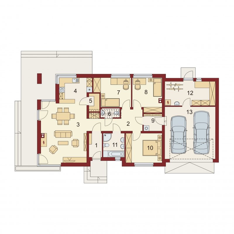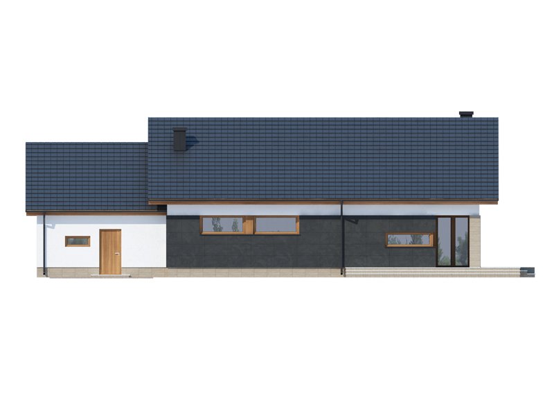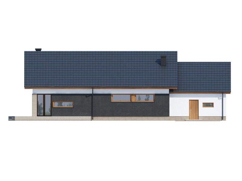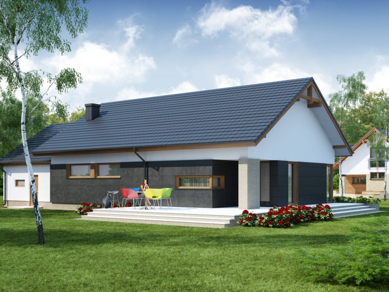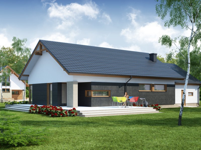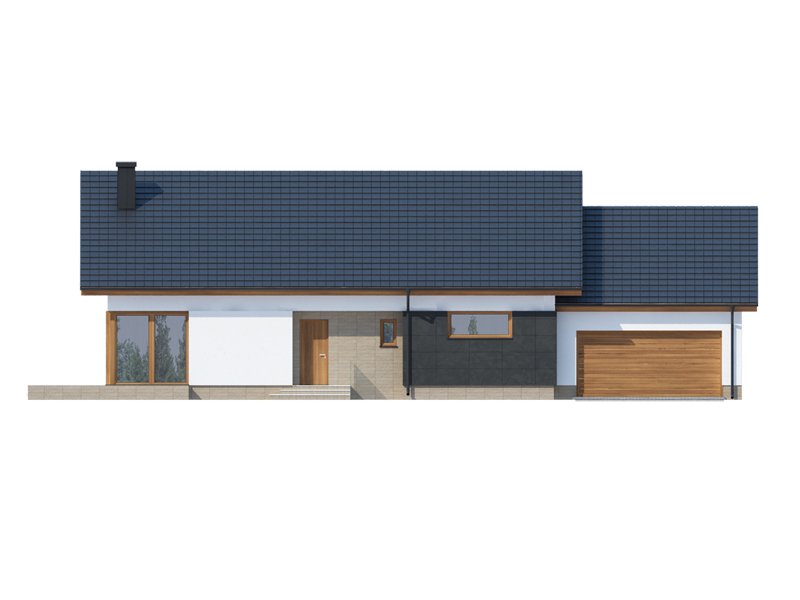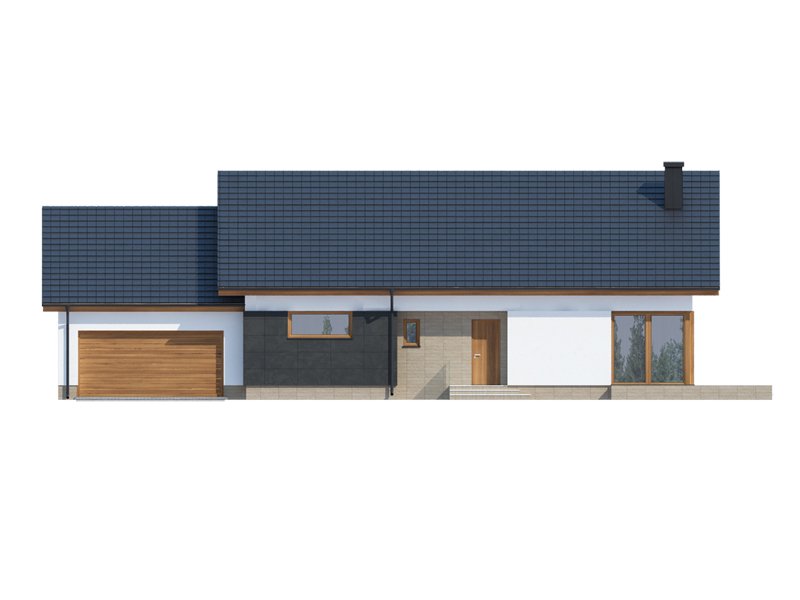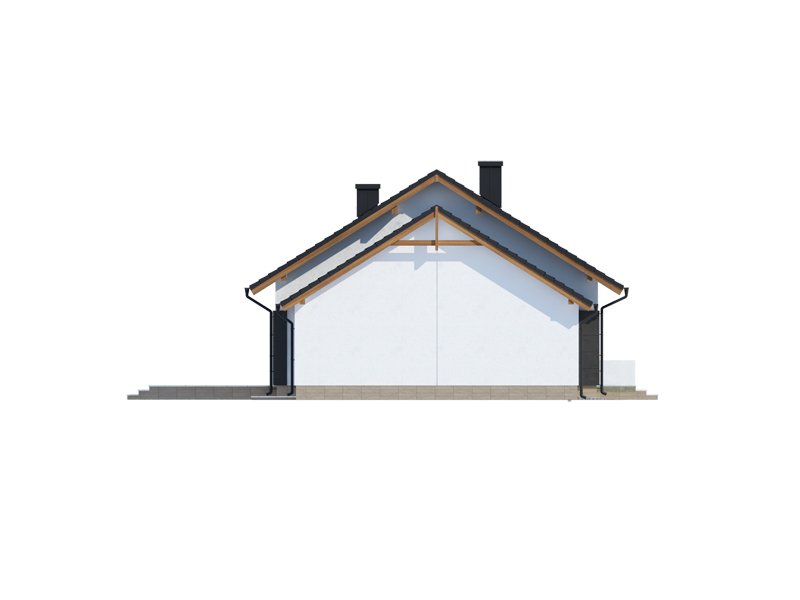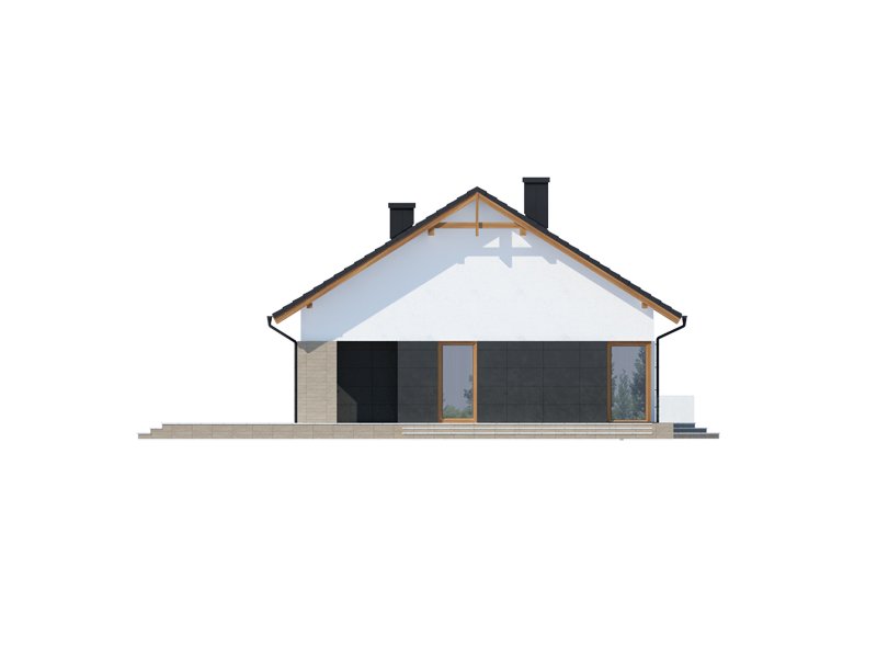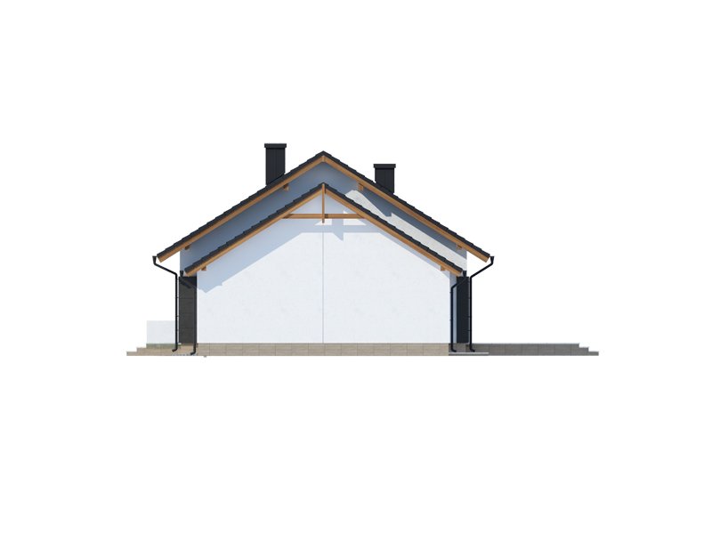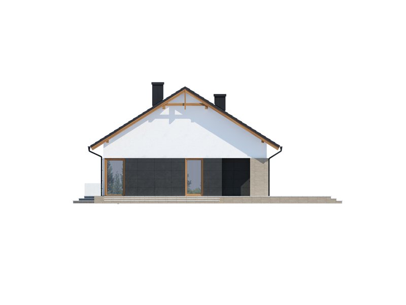 Midas 2 PS jest domem świetnie wpisującym się w szeroką i krótką działkę. Jest stworzony dla rodziny 4-osobowej z upodobaniem do rozwiązań prostych i nowoczesnych. Dom generalnie dzieli się na 2 części – dzienną oraz nocną. Ta pierwsza to salon z jadalnią i otwarta na nie kuchnia ze spiżarnią. Zwolennicy kuchni zamkniętych mają możliwość rozdzielenia kuchni od dwóch pozostałych pomieszczeń. Salon posiada kominek komfortowo usytuowany w niedużej odległości zarówno od jadalni jak i strefy wypoczynkowej salonu. W tej części zaprojektowano duże narożne przeszklenie doskonale doświetlające wnętrze i umożliwiające wyjście na taras od strony frontowej. Druga część budynku to strefa nocna. Składa się z trzech sypialni, łazienki i pomieszczenia gospodarczego. Przez to ostatnie umożliwiono przejście do dwustanowiskowego garażu. Garaż z kolei graniczy z obszernym pomieszczeniem gospodarczym z użytecznym dodatkowym wyjściem na tylnią część domu. Istnieje możliwość zaadaptowania poddasza na dodatkowe pomieszczenia użytkowe, dzięki umieszczeniu schodów w miejscu pomieszczenia WC.