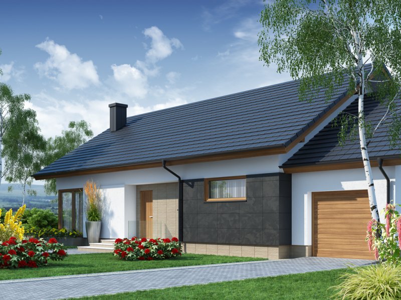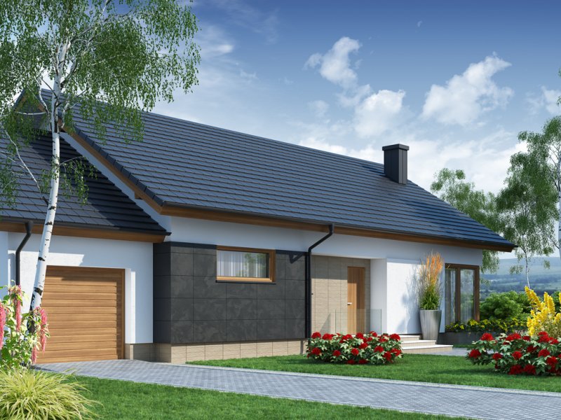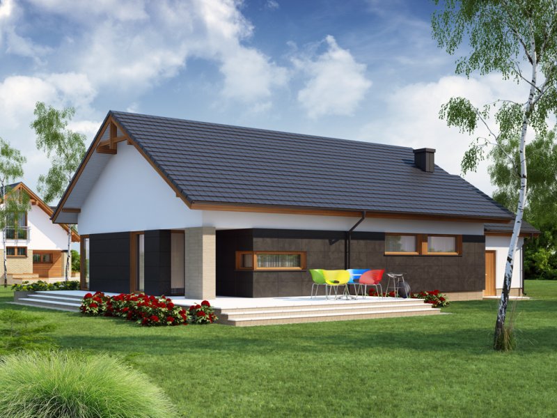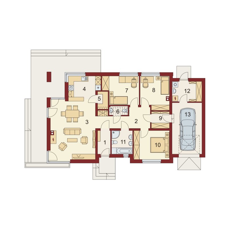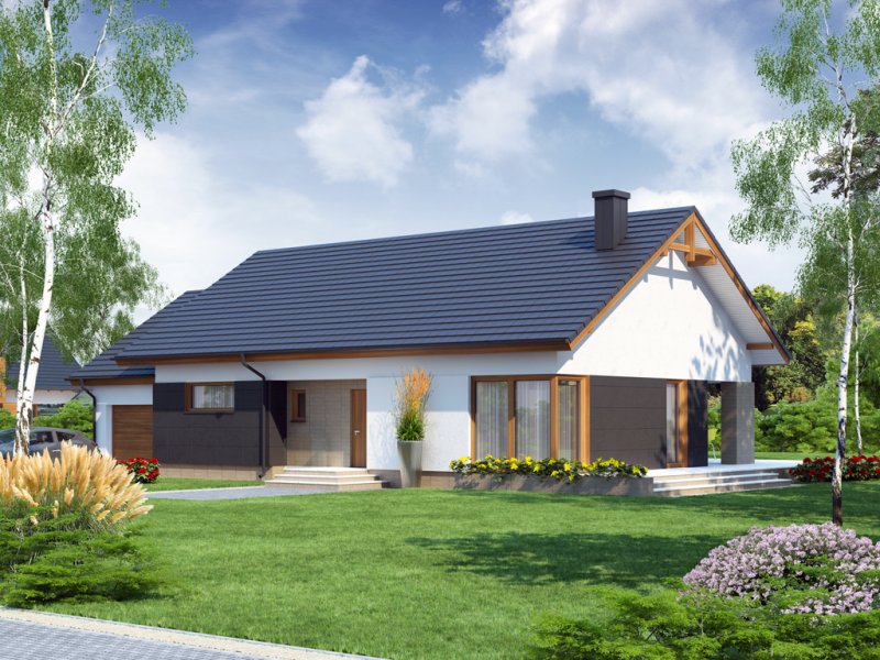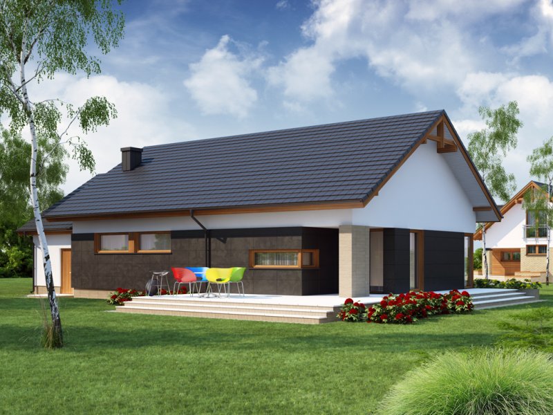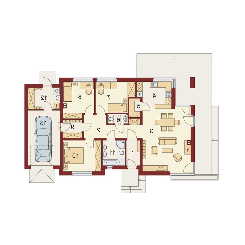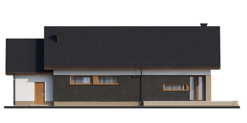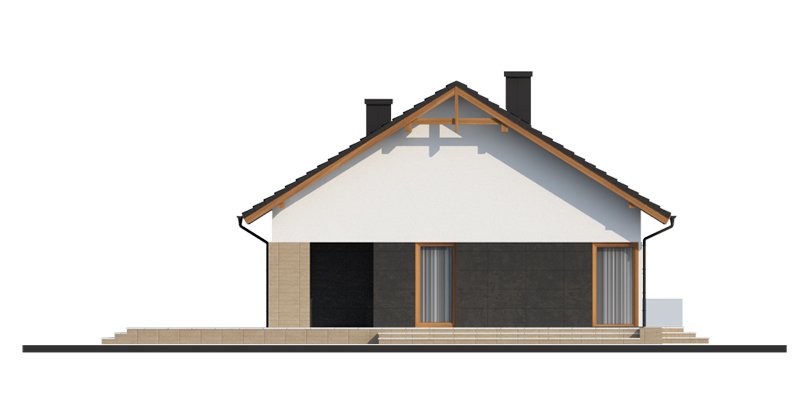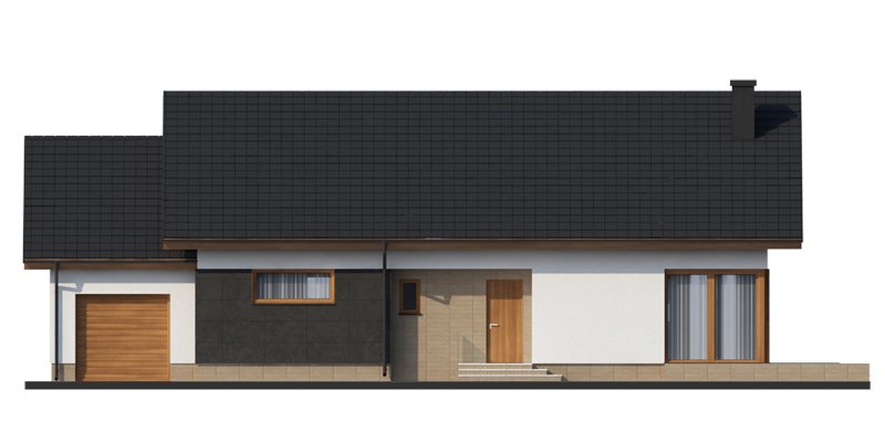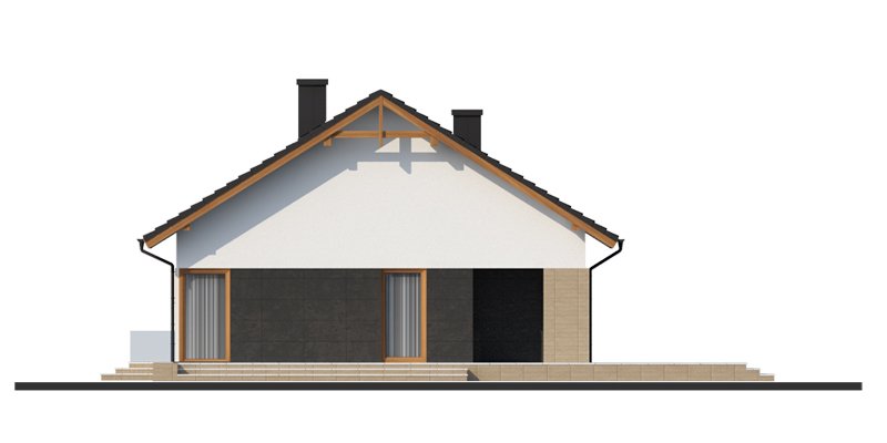 Midas jest domem świetnie wpisującym się w szeroką i krótką działkę. Jest stworzony dla rodziny 4-osobowej z upodobaniem do rozwiązań prostych i nowoczesnych. Dom generalnie dzieli się na 2 części – dzienną oraz nocną. Ta pierwsza to salon z jadalnią i otwarta na nie kuchnia ze spiżarnią. Zwolennicy kuchni zamkniętych mają możliwość rozdzielenia kuchni od dwóch pozostałych pomieszczeń. Salon posiada kominek komfortowo usytuowany w niedużej odległości zarówno od jadalni jak i strefy wypoczynkowej salonu. W tej części zaprojektowano duże narożne przeszklenie doskonale doświetlające wnętrze i umożliwiające wyjście na taras od strony frontowej. Druga część budynku to strefa nocna. Składa się z trzech sypialni, łazienki i garderoby. Przez tę ostatnią umożliwiono przejście do jednostanowiskowego garażu. Garaż z kolei graniczy z pomieszczeniem gospodarczym z użytecznym dodatkowym wyjściem na tylnią część domu . Istnieje możliwość zaadaptowania poddasza na dodatkowe pomieszczenia użytkowe , dzięki umieszczeniu schodów w miejscu pomieszczenia WC.