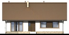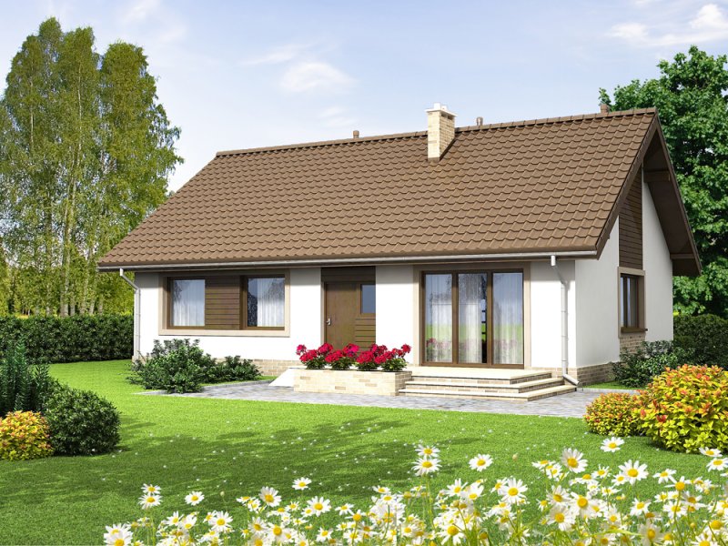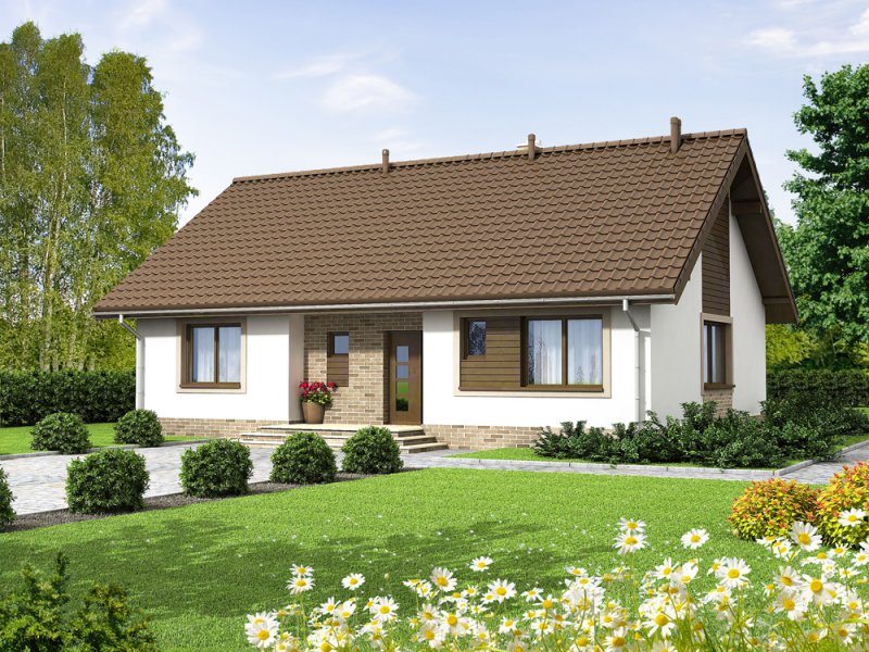Mokka 2 to mały uroczy dom parterowy, który świetnie wpisuje się w każde otoczenie, a zarazem posiada swój oryginalny styl. Dzięki bardzo prostej formie jest tani i łatwy w budowie. Mimo niewielkiego rozmiaru oferuje komfortowe pokoje, dodatkową toaletę, oraz duże pomieszczenie gospodarcze. Istotną cecha projektu jest podział na strefę dzienną i nocną. W tej pierwszej zlokalizowano przestronny salon z jadalnią, oraz dużą kuchnię ze spiżarnią. Wiatrołap ma wydzielone miejsce na szafę. Ważnym elementem każdego domu, bez garażu, jest pomieszczenie gospodarcze z bezpośrednim wyjściem na ogród. Jego rozmiary pozwalają zainstalować kocioł na paliwo stałe. W części nocnej zaprojektowano trzy komfortowe sypialnie i łazienkę z wnęką na pralkę i dodatkową przestrzeń do przechowywania. Prosta bryła i nieskomplikowana konstrukcja, zdecydowanie ułatwią i przyspieszą realizację. Aby zapewnić niskie koszty eksploatacji i nie zwiększać kosztów budowy, w projekcie zastosowano rozwiązania energooszczędne na poziomie ekonomicznie uzasadnionym.