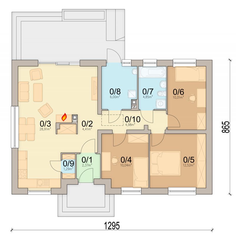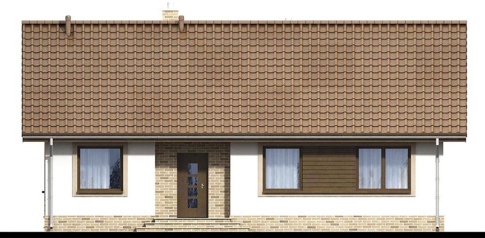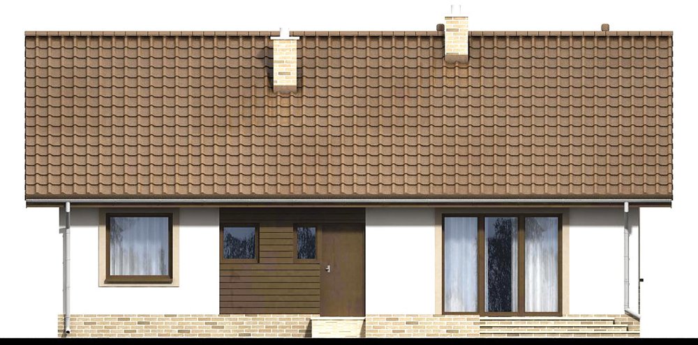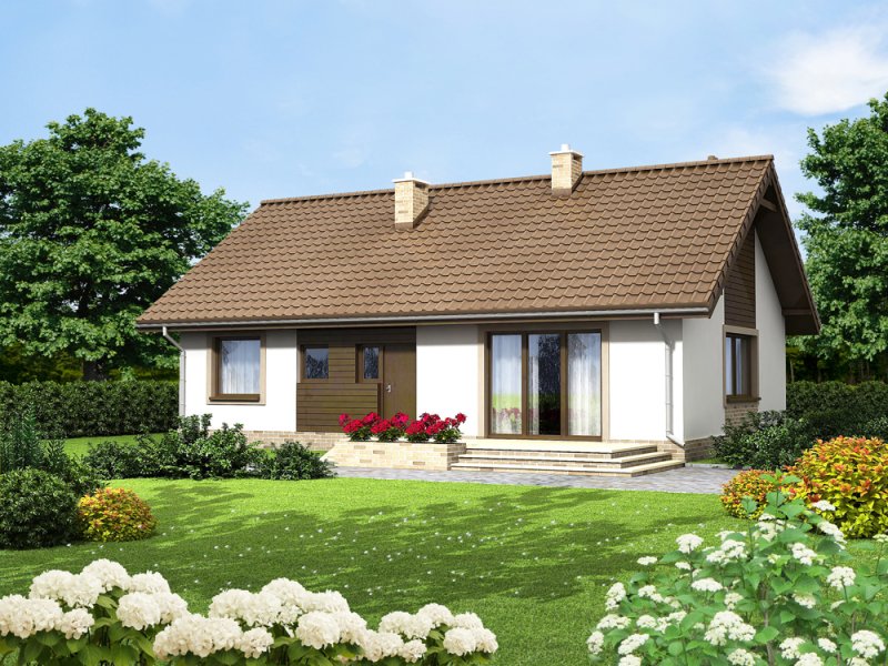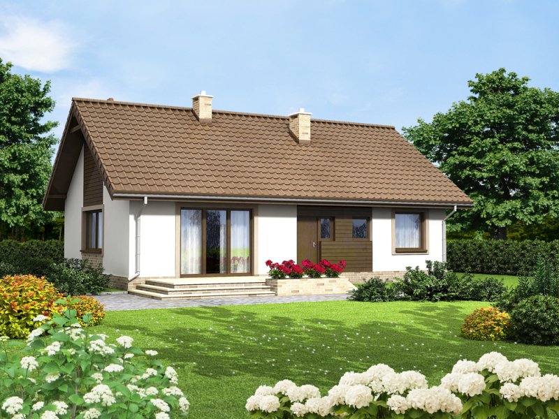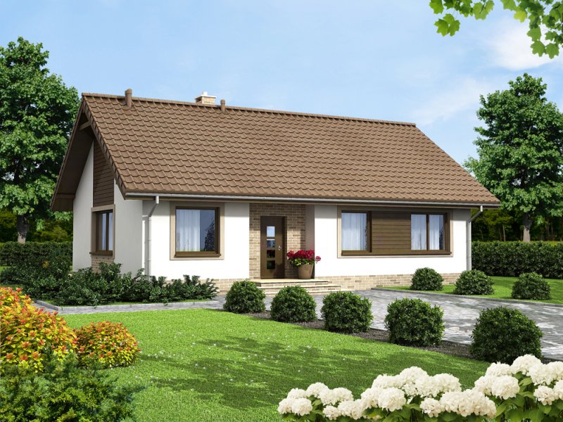 Mokka 3 to mały uroczy dom parterowy, który świetnie wpisuje się w każde otoczenie, a zarazem posiada swój oryginalny styl. Dzięki bardzo prostej formie jest tani i łatwy w budowie. Mimo niewielkiego rozmiaru oferuje komfortowe pokoje, spiżarnię, oraz duże pomieszczenie gospodarcze. W centrum domu zaprojektowano pion z kominkiem i wnęką na szafę. Dzięki temu rozwiązaniu, salon jest wizualnie oddzielony od strefy holu, co czyni go bardziej przytulnym, a wnętrze staję się ciekawsze. Ważnym elementem każdego projektu, bez garażu, jest pomieszczenie gospodarcze z bezpośrednim wyjściem na ogród. Jego rozmiary pozwalają zainstalować kocioł na paliwo stałe. W części nocnej zaprojektowano trzy komfortowe sypialnie i łazienkę. Prosta bryła i nieskomplikowana konstrukcja, zdecydowanie ułatwią i przyspieszą realizację. Aby zapewnić niskie koszty eksploatacji i nie zwiększać kosztów budowy, w projekcie zastosowano rozwiązania energooszczędne na poziomie ekonomicznie uzasadnionym.