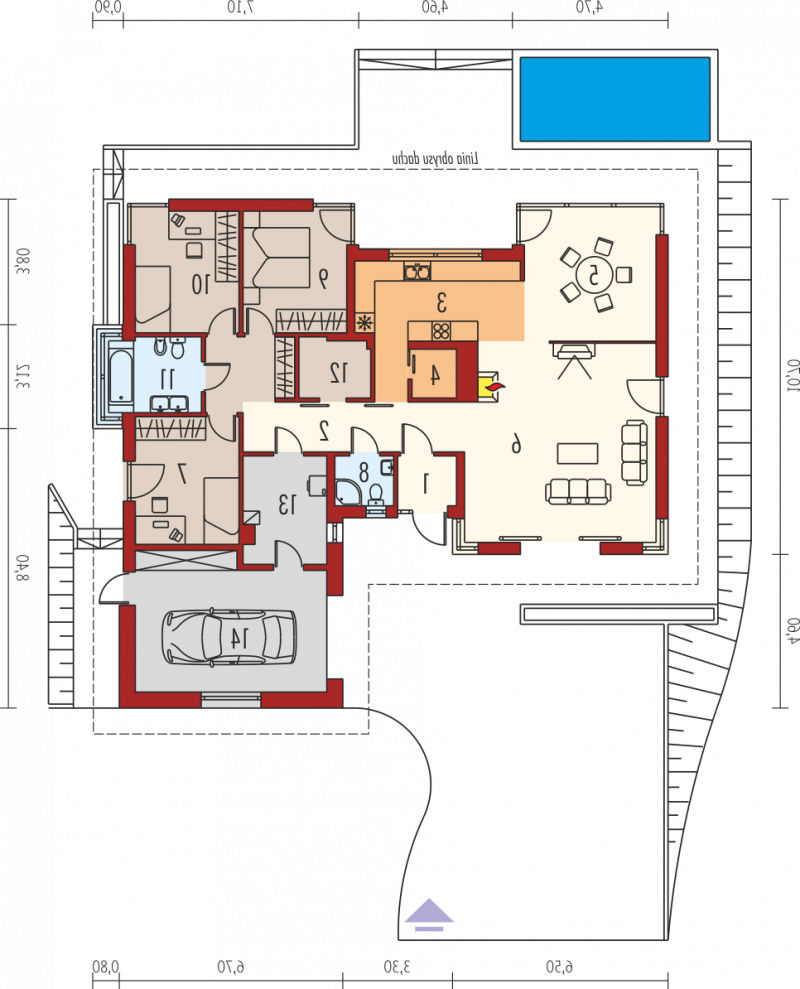 Dom zaprojektowany w technologii murowej ze stropem gęstożebrowym. Schody wewnętrzne drewniane. Dach o konstrukcji drewnianej pokryty dachówką ceramiczną Röben. Więźba dachowa dostępna również w systemie prefabrykacji drewnianej. Elewacje wykończono tynkiem mineralnym i okładziną kamienną, cokół - kamieniem. Stolarka okienna drewniana lub PCV.