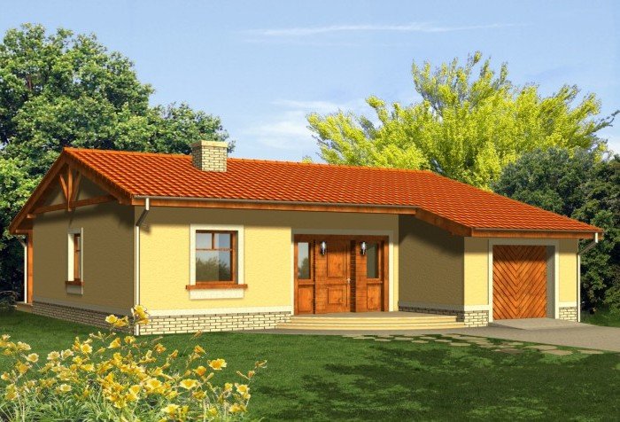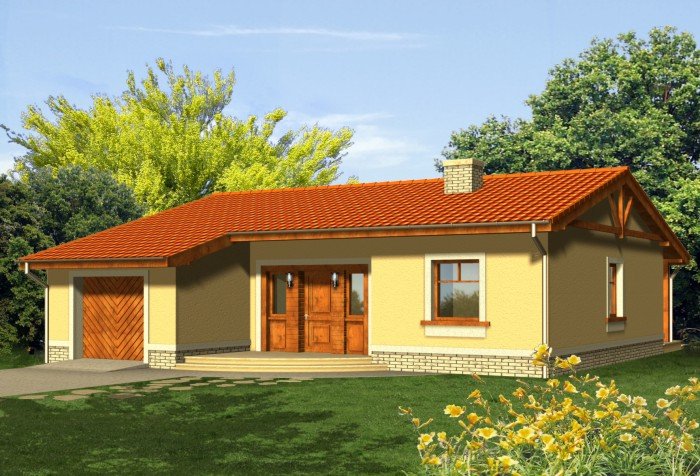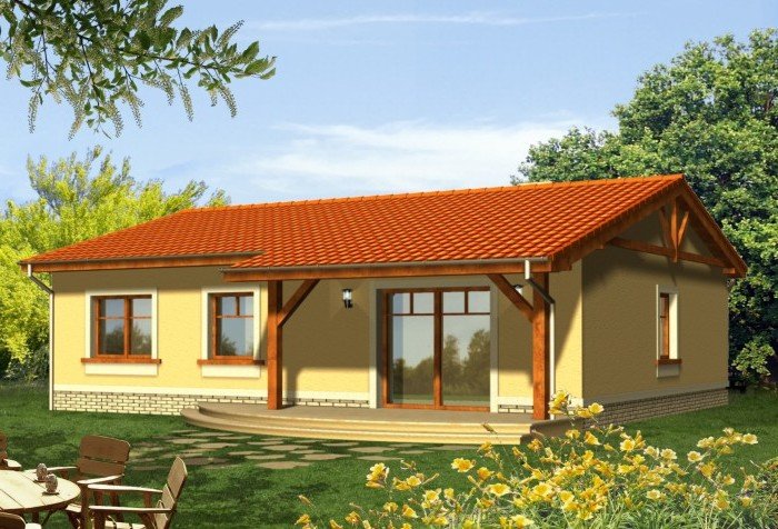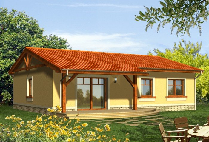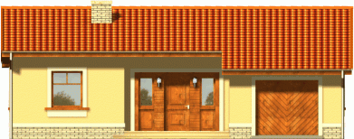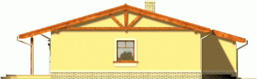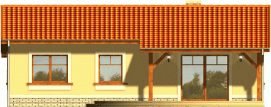 Ekonomiczny dom z dachem dwuspadowym z reprezentacyjnym wejściem głównym. Od strony ogrodu niewątpliwą jego atrakcją jest szeroki taras zadaszony przedłużoną połacią dachu, opartą na drewnianych słupach.