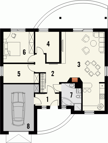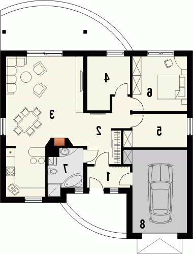 Budynek niepodpiwniczony parterowy. Obok salonu z kuchnią zaprojektowano także trzy pokoje. Łazienka z wanną i prysznicem przylega do bloku kominowego zawierającego przewody kominowe zarówno od pieca c.o., jak i kominka w pokoju dziennym. Dokumentacja dostępna również w odbiciu lustrzanym.