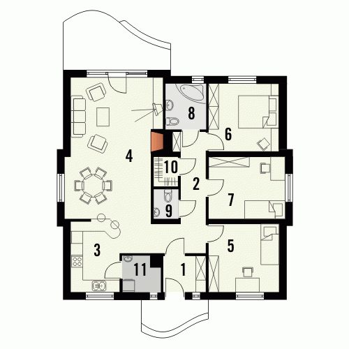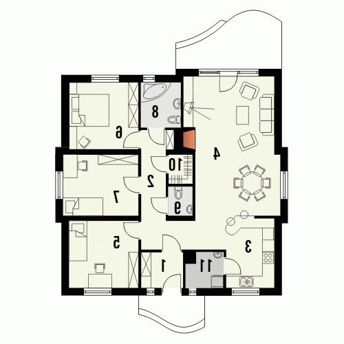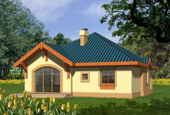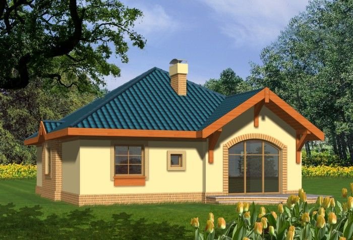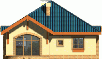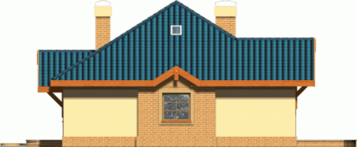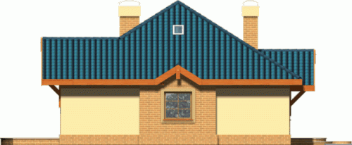 Budynek niepodpiwniczony parterowy. W podziale wnętrza widoczna strefa dzienna i nocna. W części dziennej znajduje się kuchnia oraz salon z aneksem jadalnym i wyjściem na taras oraz kominkiem. Z kuchni dostępne jest pomieszczenie gospodarcze mogące służyć również jako spiżarnia. W części sypialnej znalazły się 3 sypialnie wraz z przestronną łazienką, osobnym wc oraz garderobą. Możliwe zaadaptowanie poddasza o powierzchni 23m2. Dokumentacja dostępna jest również w odbiciu lustrzanym.