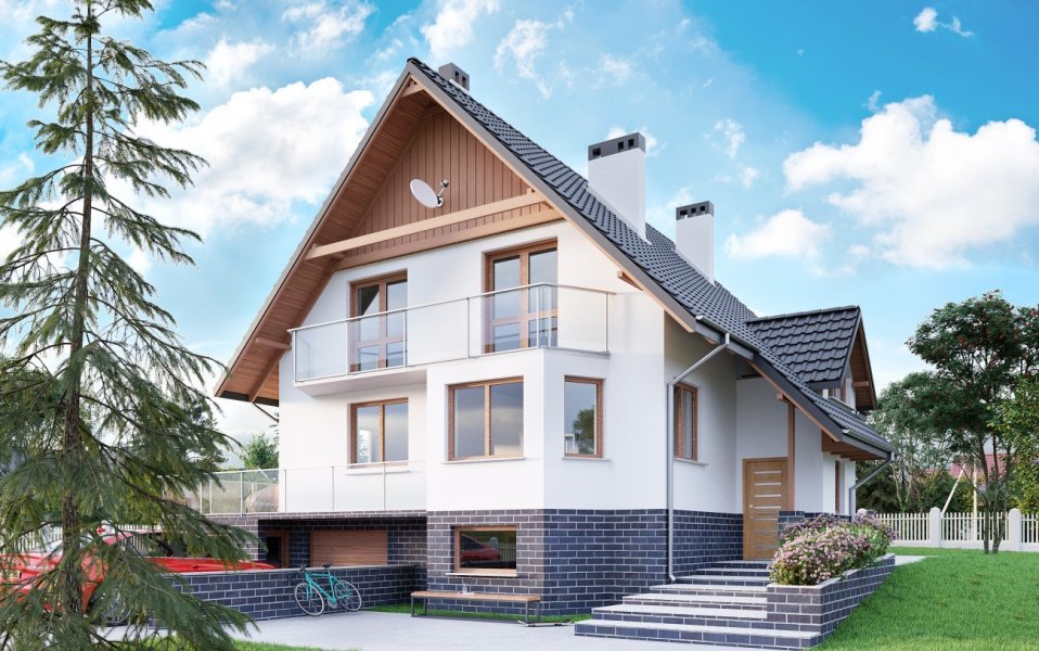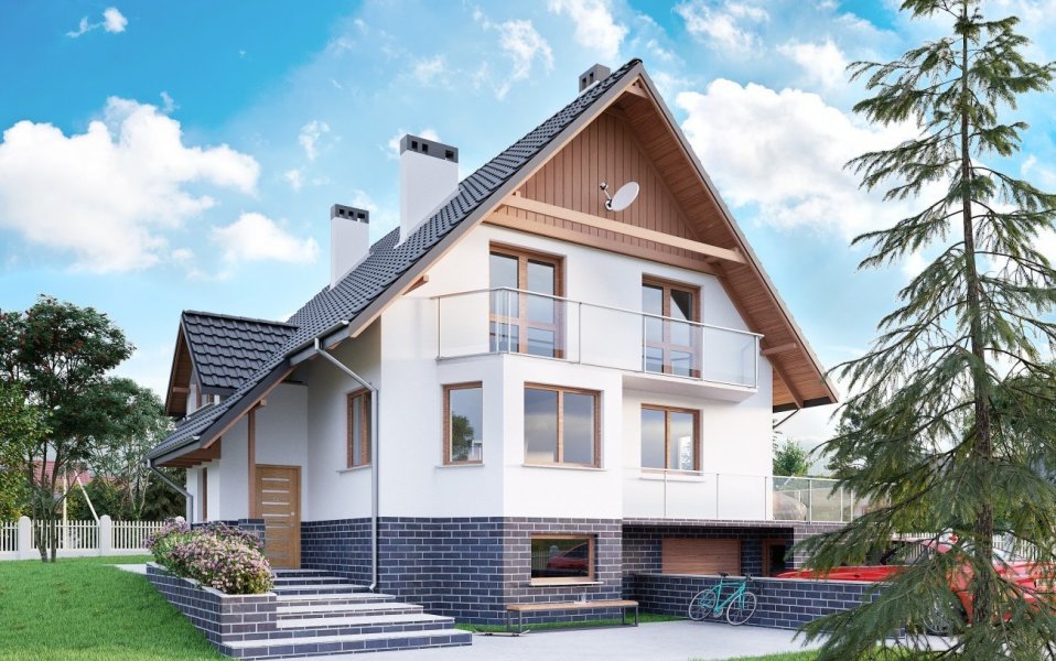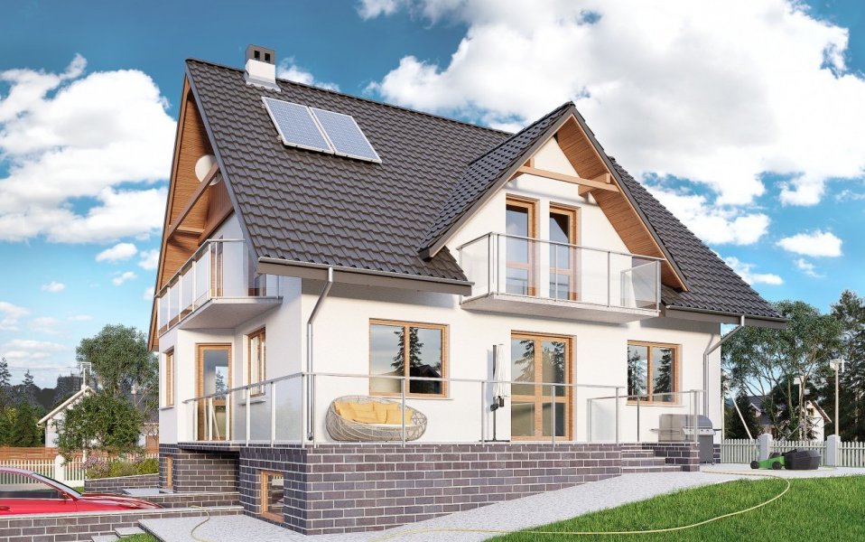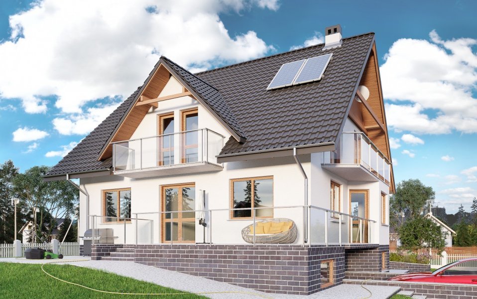 Wejście do budynku poprzez wiatrołap. Z wiatrołapu po kilku stopniach wyjście do holu. Z holu dostępny pokój dzienny, kuchnia z aneksem jadalnym, pokój gościnny, łazienka i spiżarnia. Na poddaszu znajdują się 3 pokoje sypialne, łazienka i garderoba. Budynek jest częściowo podpiwniczony. Piwnice mieszczą garaż, kotłownię oraz pralnię. Dodatkowo pod tarasem znajduje się pomieszczenie gospodarcze dostępne z zewnątrz. Zwarta bryła budynku wzbogacona została balkonami, tarasem wysuniętym aneksem jadalnym. Dodatkowym akcentem są lukarny (klatki schodowej i balkonowa).