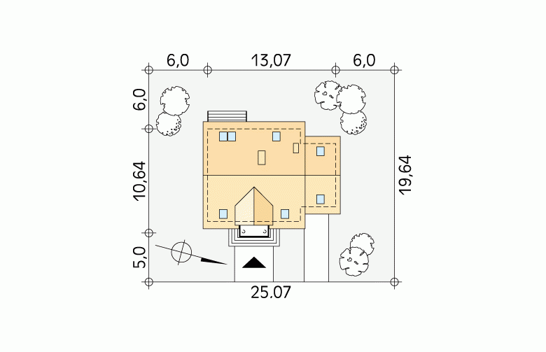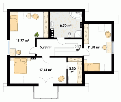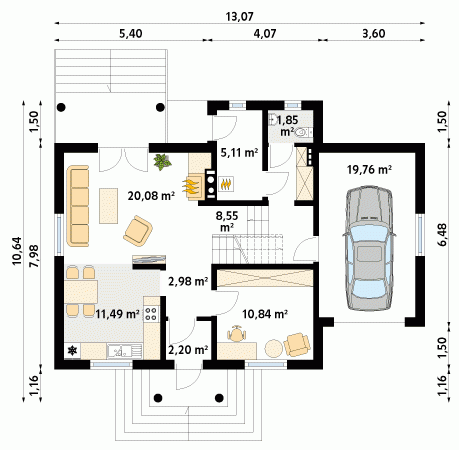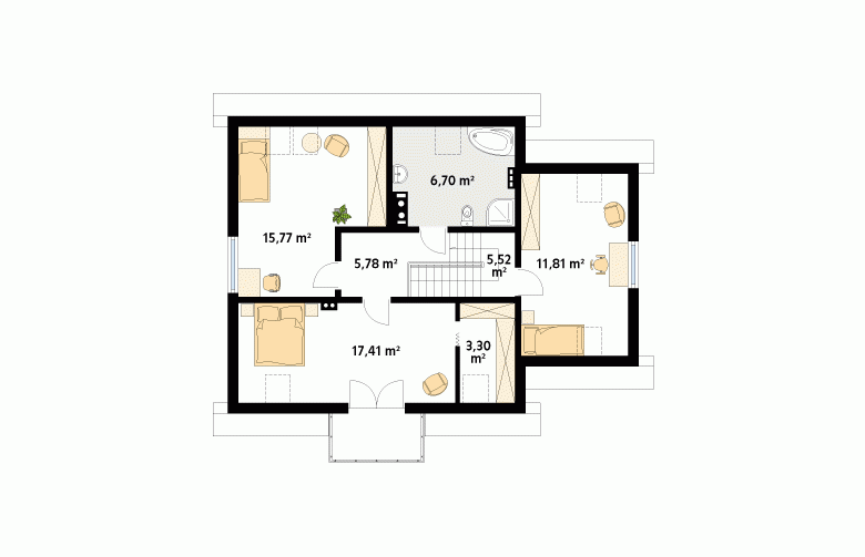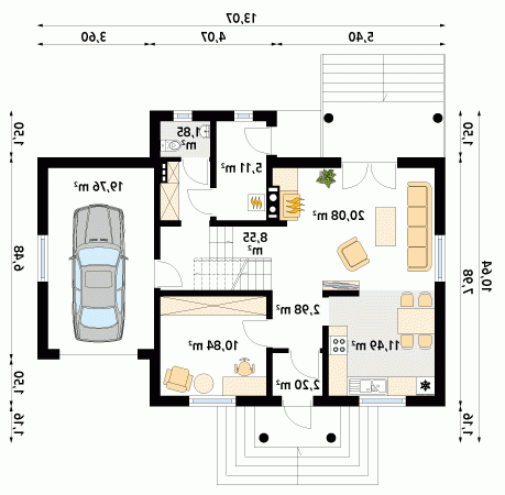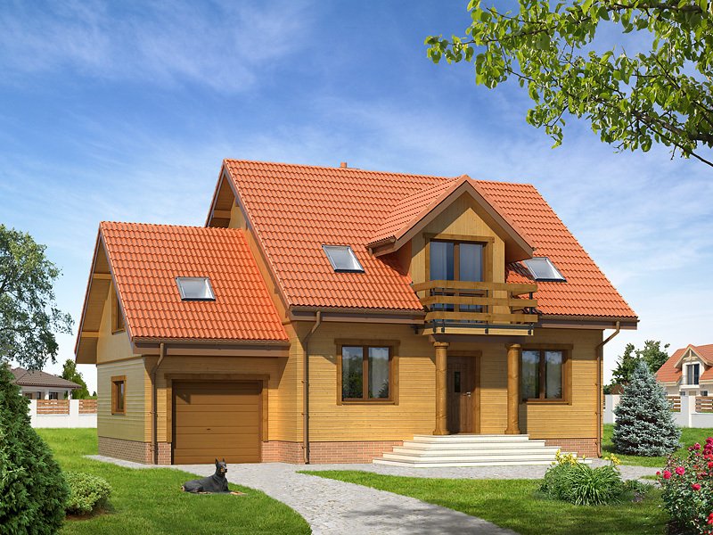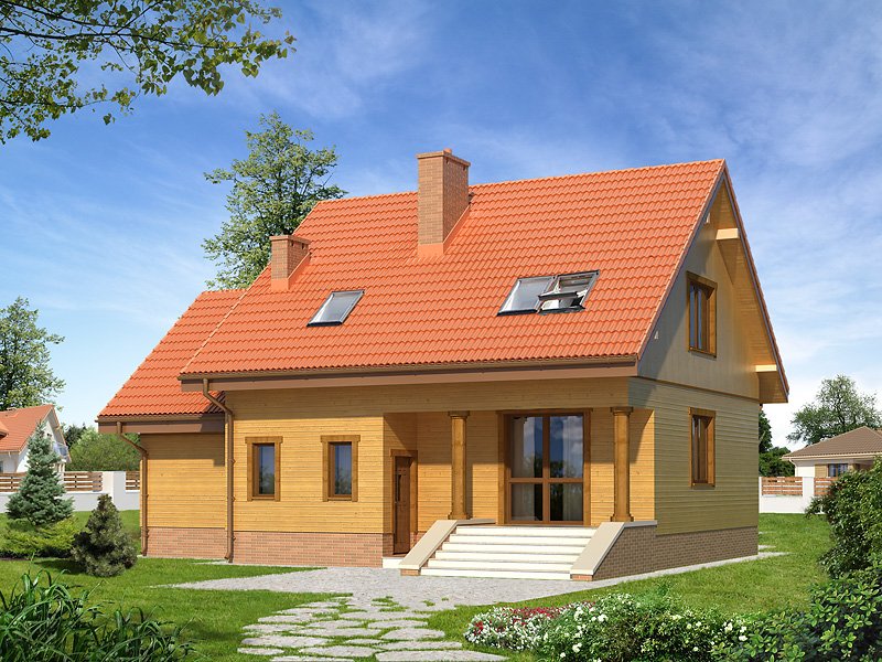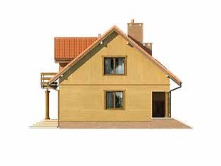 Budynek o zwartej bryle, przeznaczony dla 4 - 5-osobowej rodziny. Na parterze część dzienna, dodatkowy pokój oraz część gospodarcza z garażem. Na poddaszu trzy wygodne pokoje, garderoba oraz przestronna łazienka.