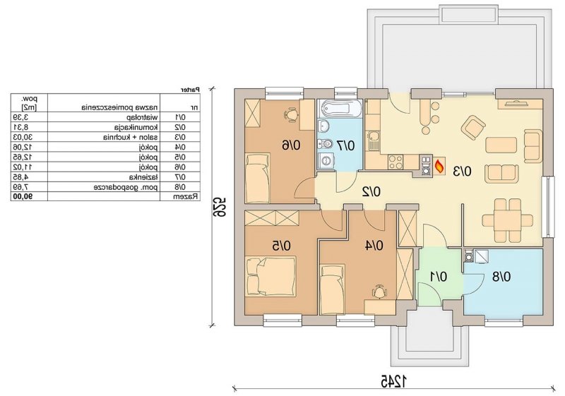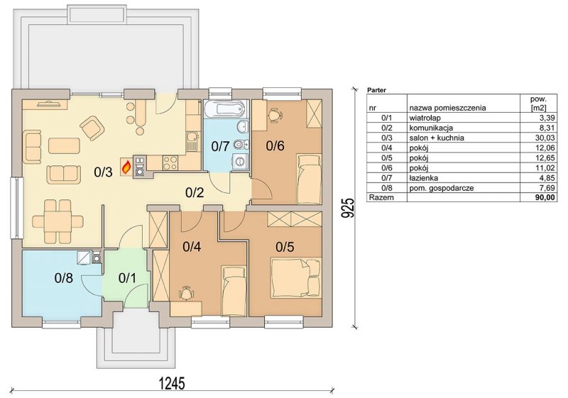 Atutem projektu jest jasny podział na strefę dzienną i nocną. W tej drugiej zlokalizowano trzy sypialnie, oraz łazienkę z miejscem na pralkę. Projekt posiada również duże pomieszczenie gospodarcze, dostępne z wiatrołapu.