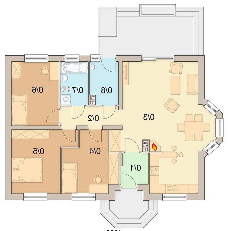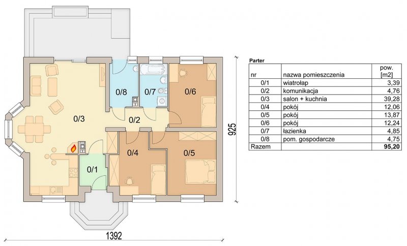 Niewątpliwym atutem projektu jest jasny podział na strefę dzienną i nocną. W tej drugiej zlokalizowano trzy sypialnie, oraz łazienkę z miejscem na pralkę. W domu przewidziano duży salon połączony z jadalnią i kuchnią. Projekt posiada również pomieszczenie gospodarcze z bezpośrednim wyjściem na ogród.
