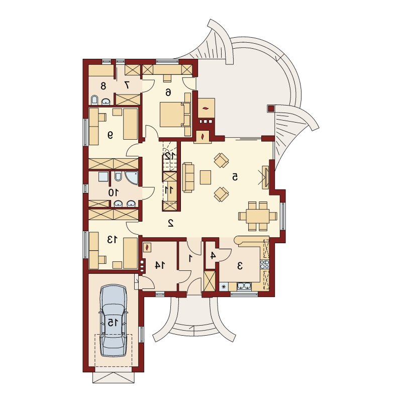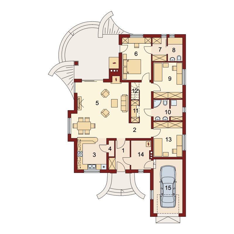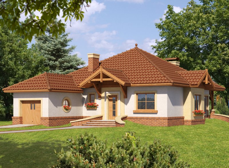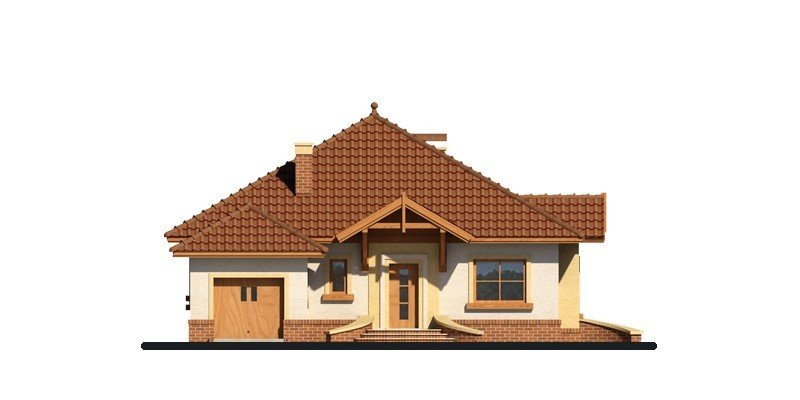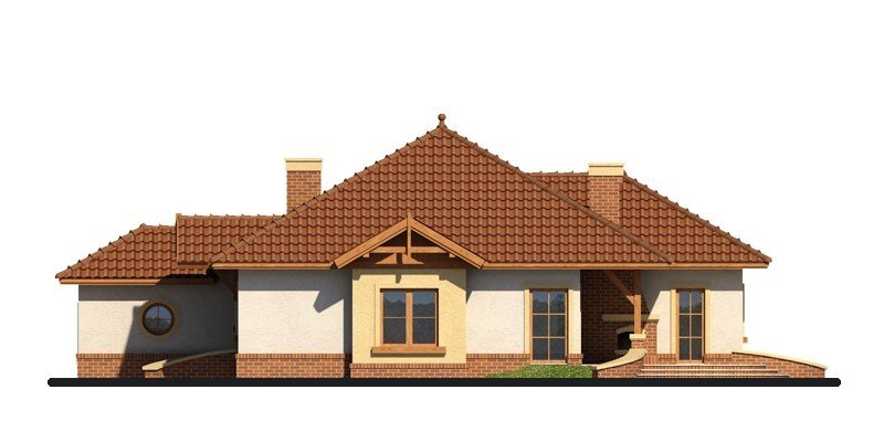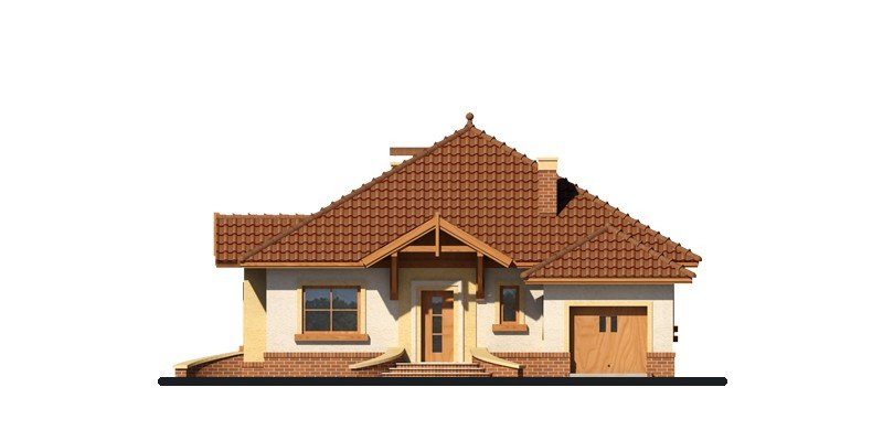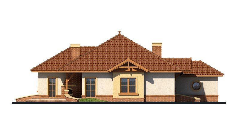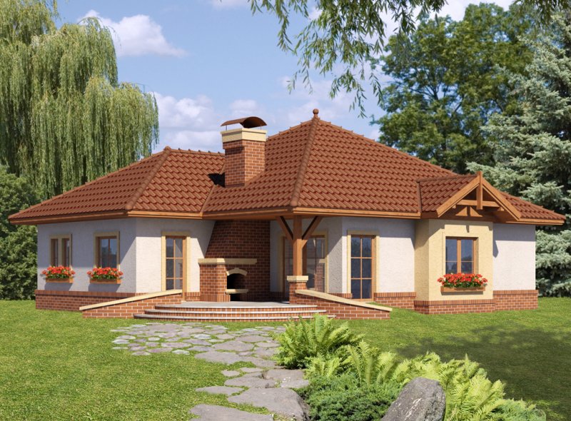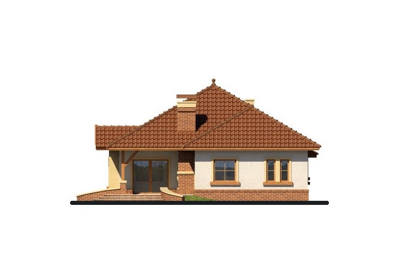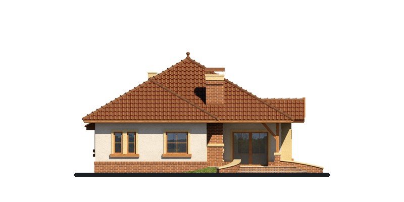 Dom parterowy z nieużytkowym poddaszem o prostej, zgrabnej bryle. Widoczny jest wyraźny podział na strefę nocną i dzienną. Zaraz przy wejściu do mieszkalnej części domu rozpościera się widok przestronnego salonu, ciekawie usytuowanego kominka oraz krajobrazu widocznego za dużym przeszkleniem. Niewątpliwym atutem projektu jest zaplanowany na tarasie grill, stanowiący integralną część budynku. Salon płynnie przechodzi w jadalnię, łączącą się z kolei z otwartą kuchnią, która może być swobodnie przekształcona w zamkniętą. W części nocnej znajduje się sypialnia gospodarzy, szczególnie atrakcyjna dzięki dostępowi do indywidualnej garderoby i łazienki oraz bezpośrednim wyjściem na taras, a także dwie mniejsze sypialnie, przedzielone łazienką. Powierzchnia wyjściowa może być także powiększona o dodatkową przestrzeń na poddaszu nieużytkowym, wykorzystaną np. jako dodatkową sypialnię, czy pokój hobby.
