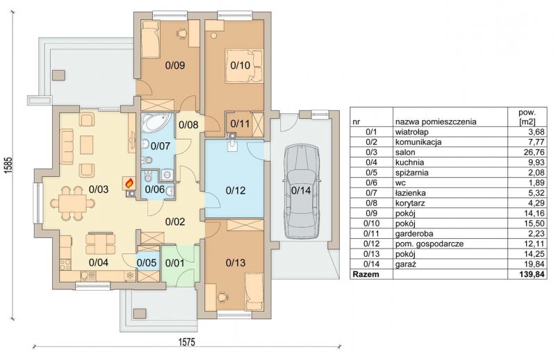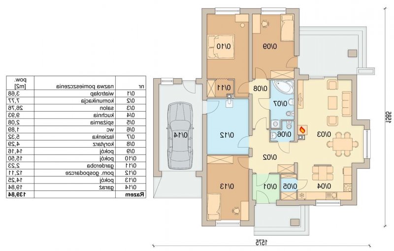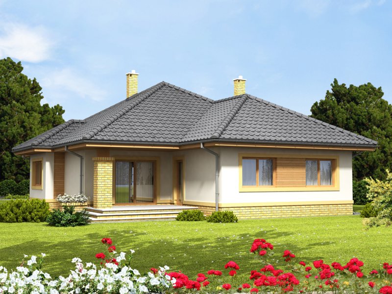 Kuchnia została zaprojektowana w taki sposób, aby można było zbudować w pełni funkcjonalny ciąg kuchenny, zakończony pionem z zabudowaną kuchenką mikrofalową i piekarnikiem. Projekt posiada trzy duże pokoje, w tym sypialnie z garderobą, oraz łazienkę z wnęką na pralkę. Wymiary pomieszczenia gospodarczego pozwalają zorganizować kotłownie na paliwo stałe.