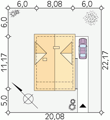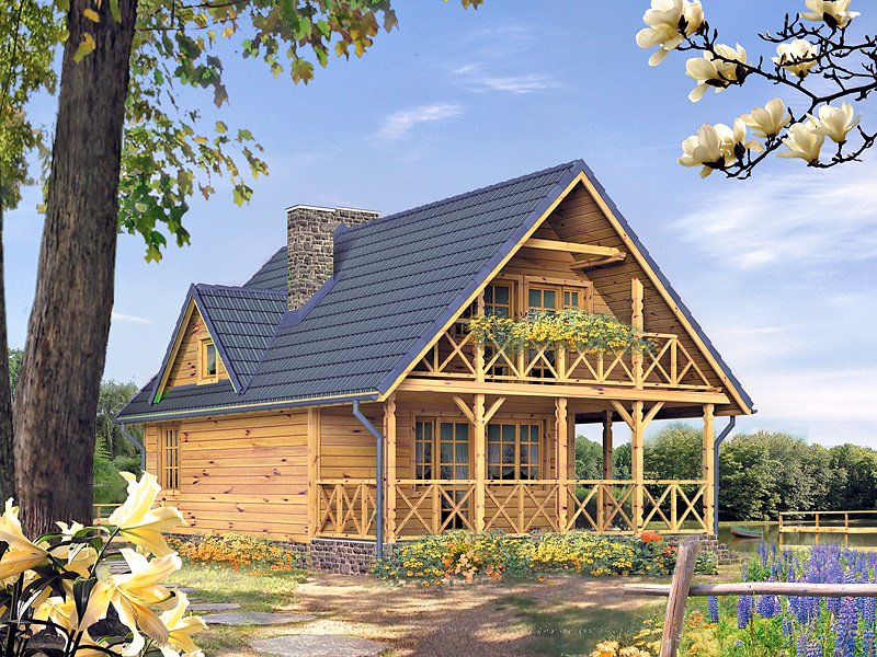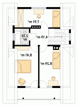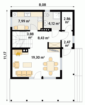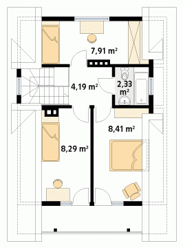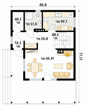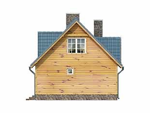 Mały dom jednorodzinny o prostej, tradycyjnej bryle. Posiada duży taras oraz funkcjonalny, prosty układ.