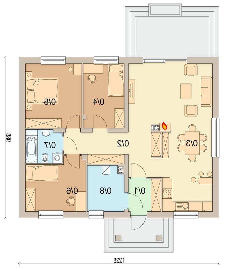 Dom posiada salon połączony z jadalnią i kuchnią, trzy komfortowe pokoje, łazienkę, oraz duże pomieszczenie gospodarcze dostępne z wiatrołapu.