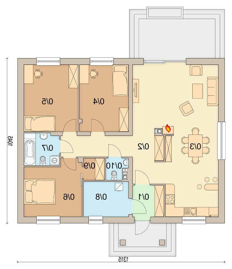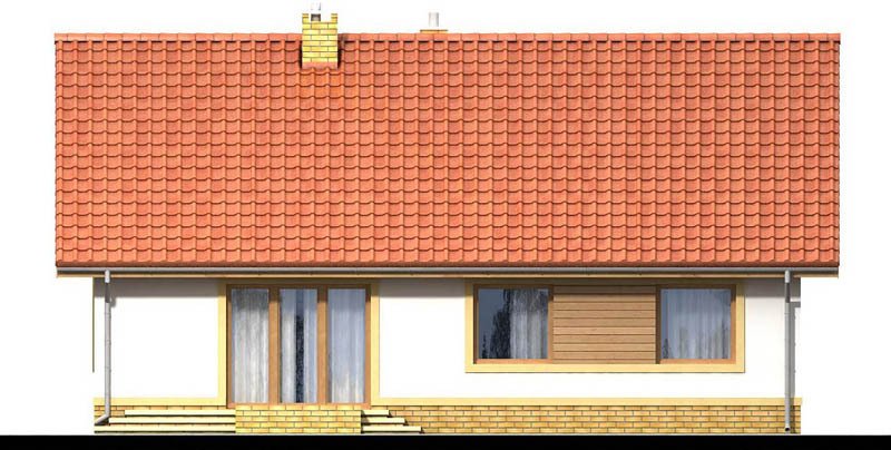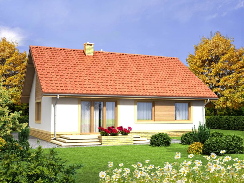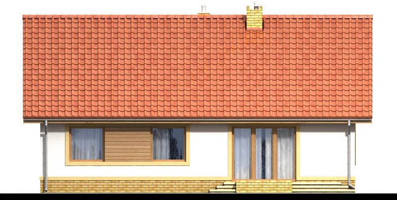Projekt posiada otwarty salon połączony z kuchnią, trzy komfortowe pokoje, łazienkę, oraz pomieszczenie gospodarcze dostępne z wiatrołapu. W korytarzu przewidziano miejsce na dużą szafę w zabudowie.