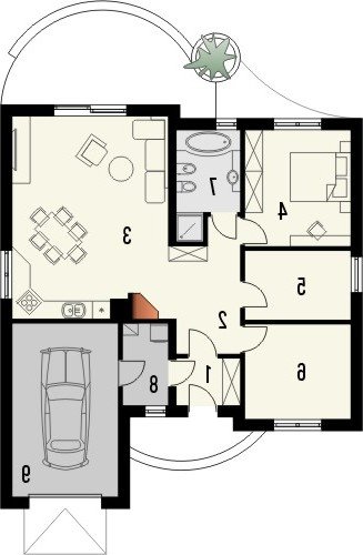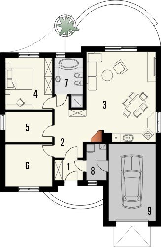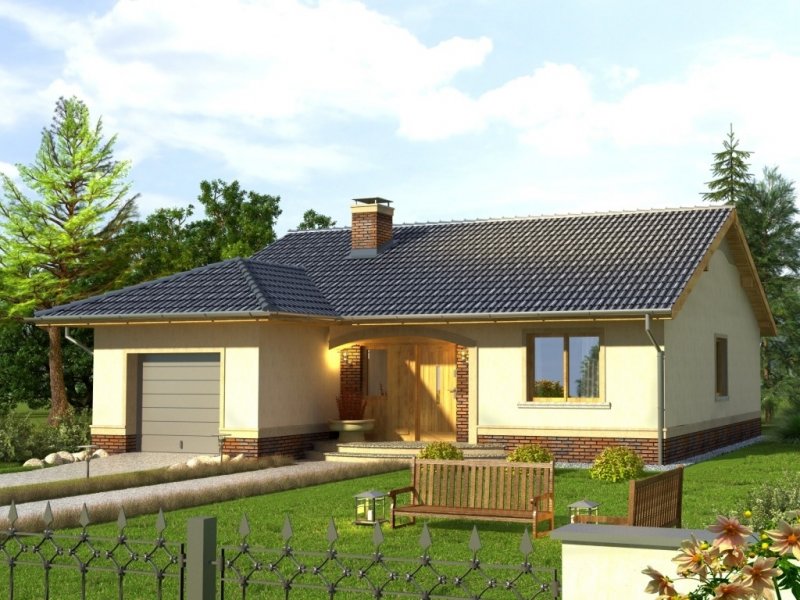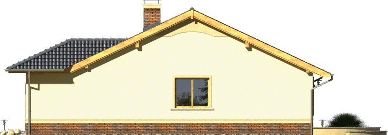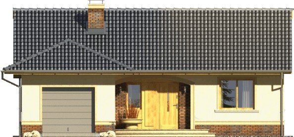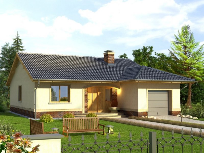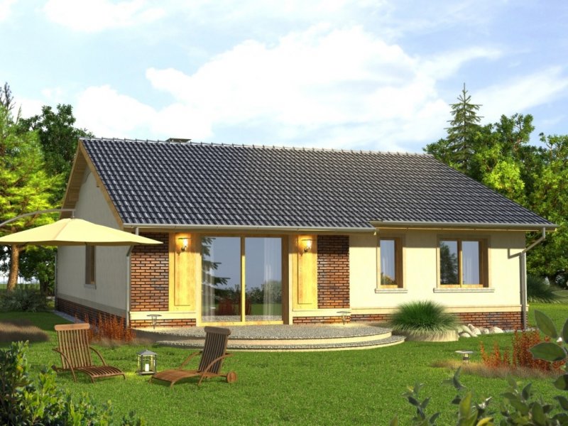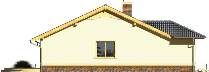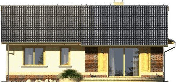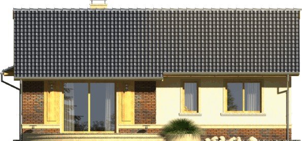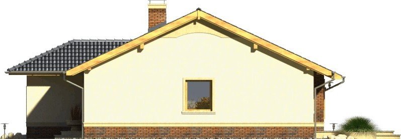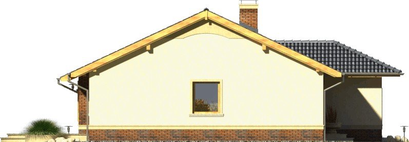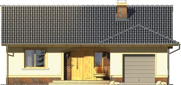 Tango to dom parterowy niepodpiwniczony z garażem jednostanowiskowym. Prosta, tradycyjna konstrukcja, brak stropu i wypłaszczony dach dwuspadowy pozwolą na wybudowanie go przy naprawdę niewielkim budżecie. Wejście jest praktycznie lekko wycofane i osłonięte łukowym podcieniem. Od ogrodu ładny, półokrągły taras z przedłużoną połacią dachu nad przesuwnymi drzwiami balkonowymi z salonu. Dokumentacja w sprzedaży jako standard oraz odbicie lustrzane. Dom oferuje trzy sypialnie z wygodną łazienką i salon połączony w jedno wnętrze z kuchnią. Atrakcją strefy dziennej jest też kominek oraz duże otwory okienne. Projekt przewiduje ściany zewnętrzne wykonane z bloczków gazobetonowych z dociepleniem. Cokoły i fragmenty ścian okładane płytkami klinkierowymi albo ceramicznymi. Sufit z płyt gipsowo-kartonowych jest podwieszany bezpośrednio do elementów więźby. Pokrycie dachu można zastosować dowolne: dachówkę cementową albo ceramiczną lub też inny materiał wybrany na etapie adaptacji. Dopuszcza się wprowadzenie zmian wszystkich materiałów na dowolnie wybrane przez inwestora.