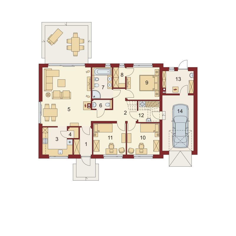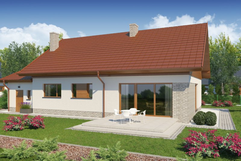 Wizualizacja jest propozycją tego jak dany projekt domu oraz jego otoczenie można zaaranżować. Sposób prowadzenia tarasu, kształt murków i elementy małej architektury typu pergole, donice itp. nie są objęte zakresem projektu. W związku z powyższym na projekcie budowlanym elementy te mogą nie być uwzględnione w projekcie ( patrz pergole ) lub zmieniony może być ich kształt i sposób prowadzenia ( wielkości tarasów, profil murków )