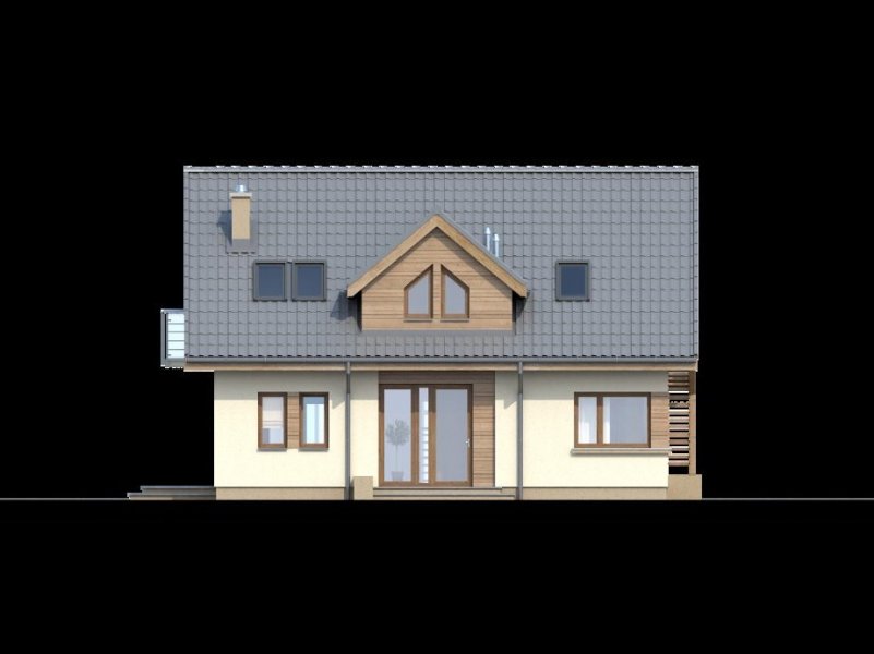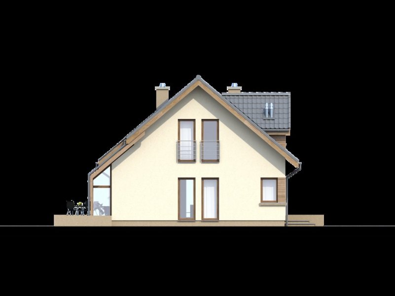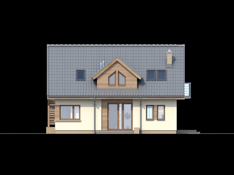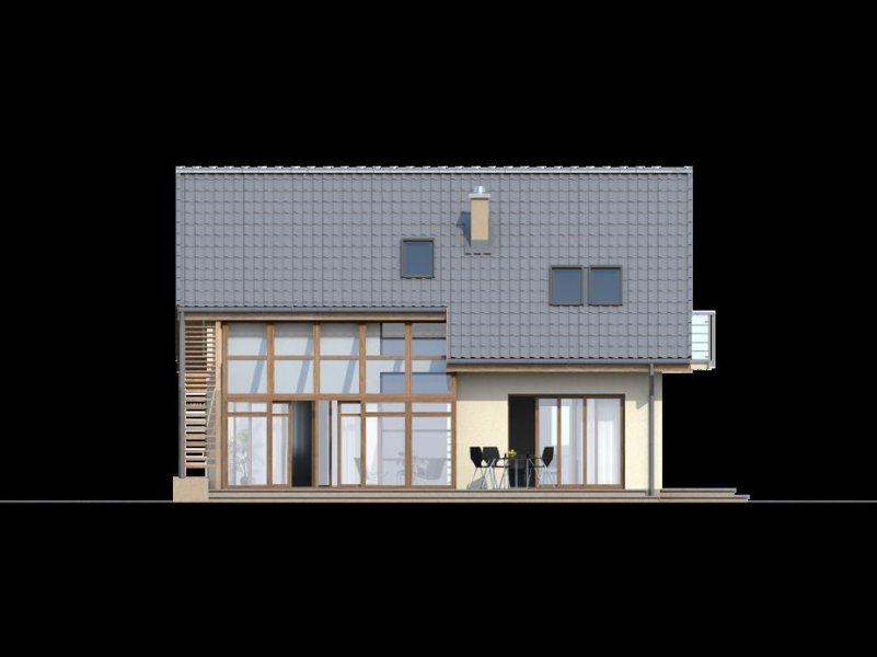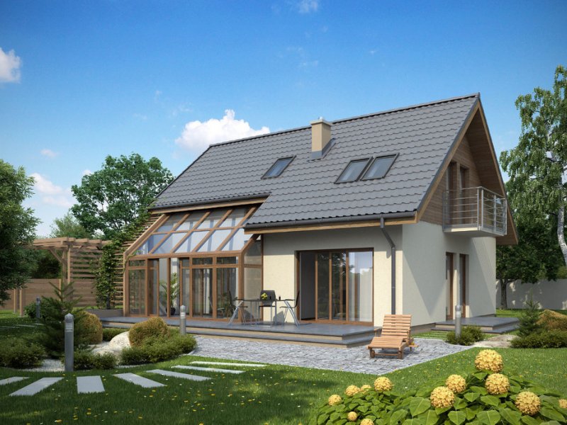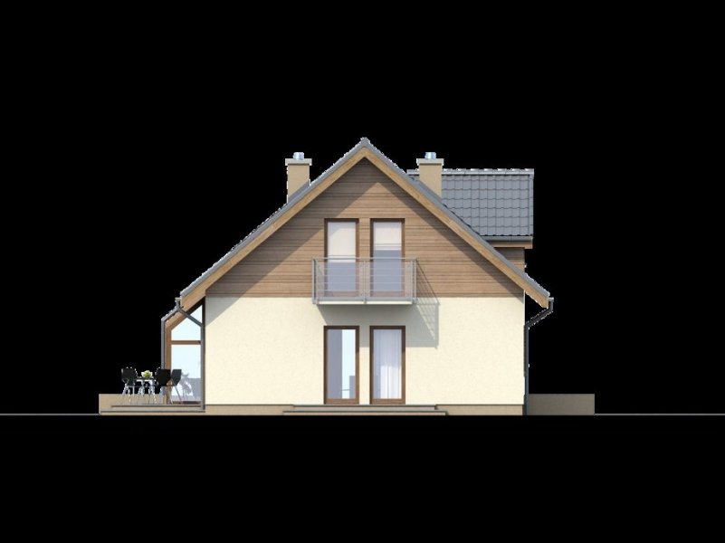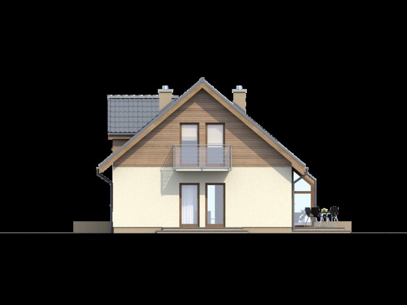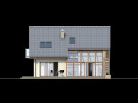 Dom jednorodzinny z poddaszem użytkowym, odpowiedni dla rodziny czteroosobowej. Budynek silnie powiązany z zielenią ogrodową poprzez przeszklony ogród zimowy dostępny z jadalni i salonu. W przedstawionej wersji parter maksymalnie otwarty, ścianki działowe ograniczone do minimum tak by całość sprawiała wrażenie jak największej przestrzeni.