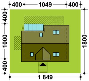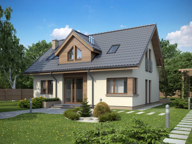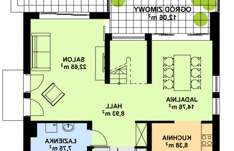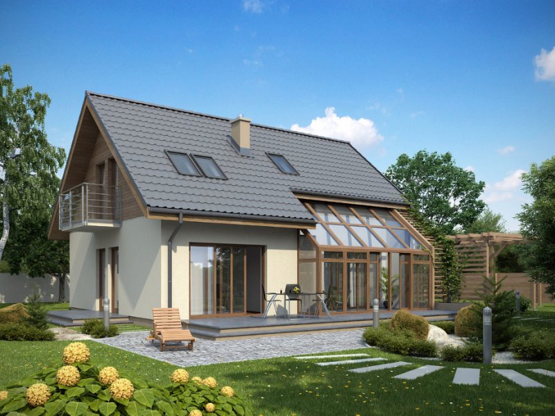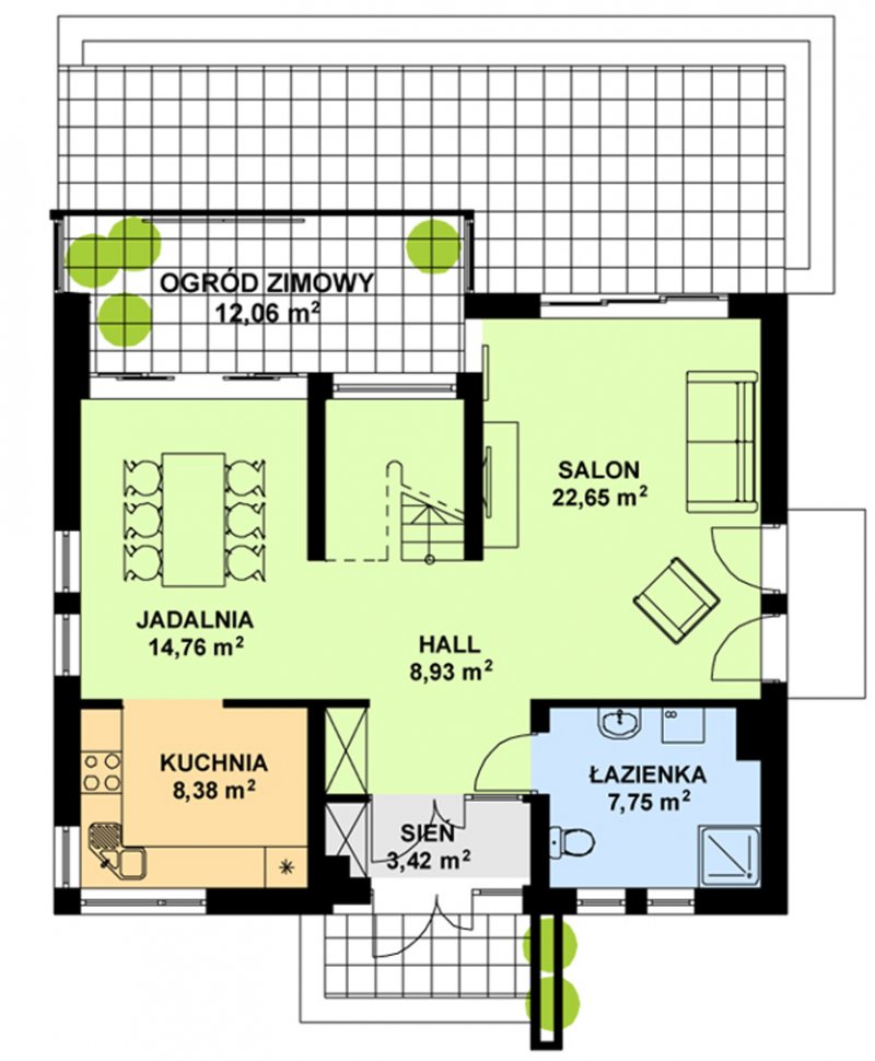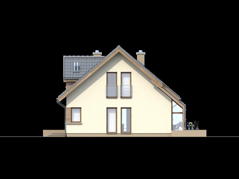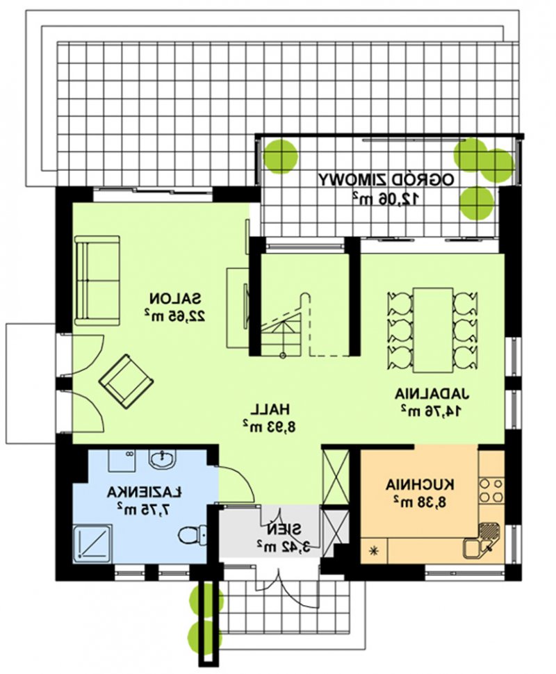 Dom jednorodzinny z poddaszem użytkowym, odpowiedni dla rodziny czteroosobowej. Budynek silnie powiązany z zielenią ogrodową poprzez przeszklony ogród zimowy dostępny z jadalni i salonu. W przedstawionej wersji parter maksymalnie otwarty, ścianki działowe ograniczone do minimum tak by całość sprawiała wrażenie jak największej przestrzeni.