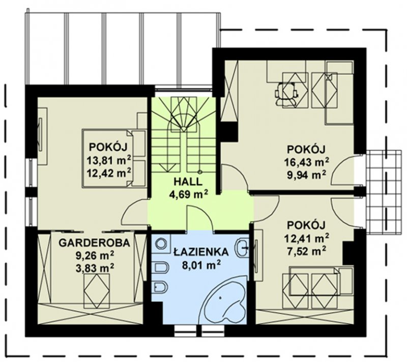Jednak dla osób bardziej ceniących sobie intymność, możliwa także inna aranżacja ścianek działowych. Piętro to sypialnia połączona z garderobą, dwa pokoje i łazienka. W naszej ofercie dostępna jest również wersja z garażem oraz wersja w odbiciu lustrzanym.