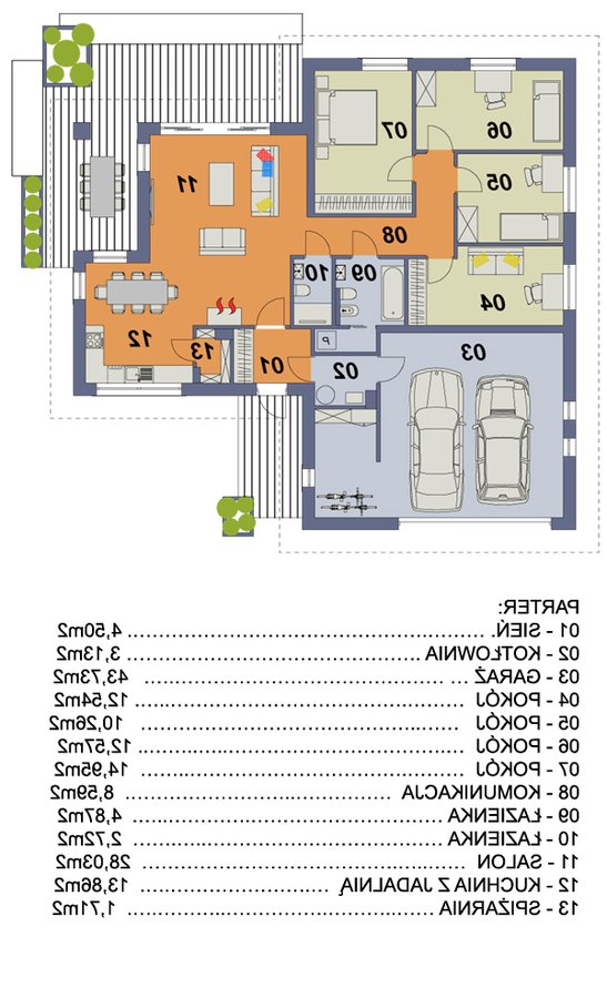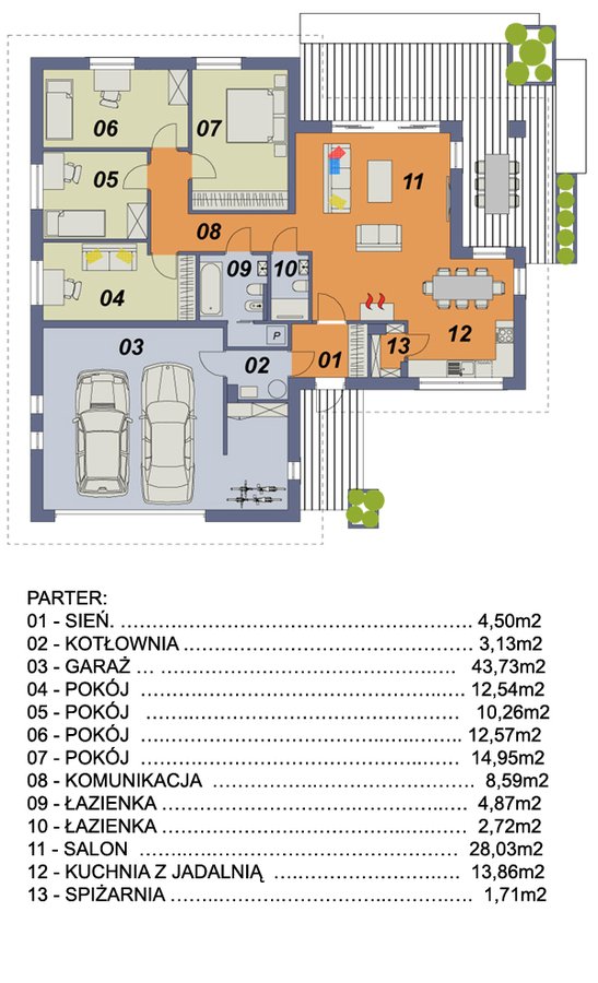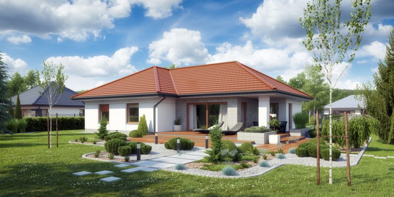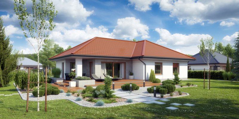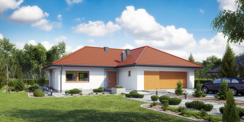 Atutem tego małego domu niewątpliwie są aż cztery sypialnie. Dom posiada przestronny salon oraz jadalnię z wyjściem na zadaszony taras. Garaż powiększony został o dodatkową przestrzeń gospodarczą, gdzie swobodnie można postawić na przykład kosiarkę, rowery i inny sprzęt turystyczny.