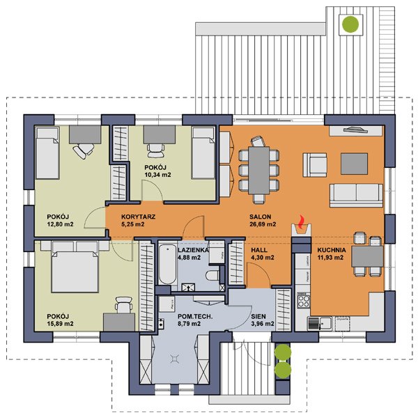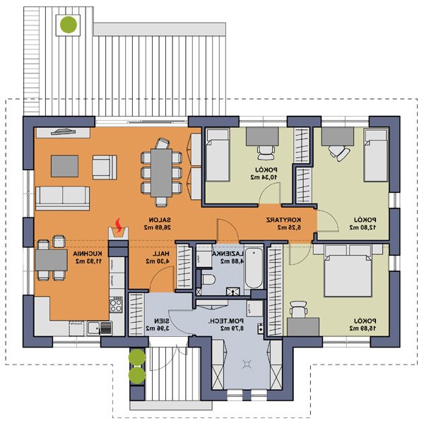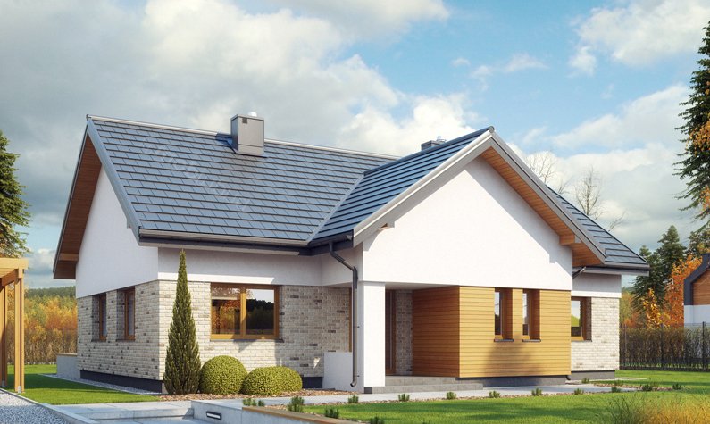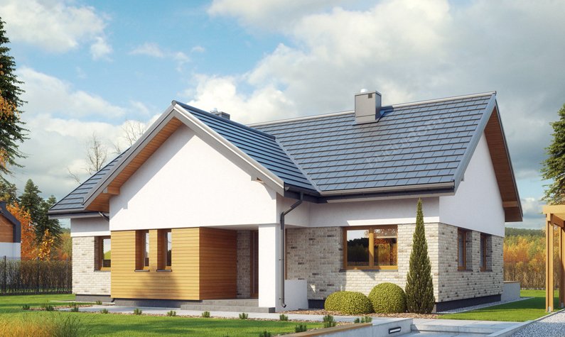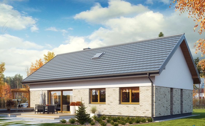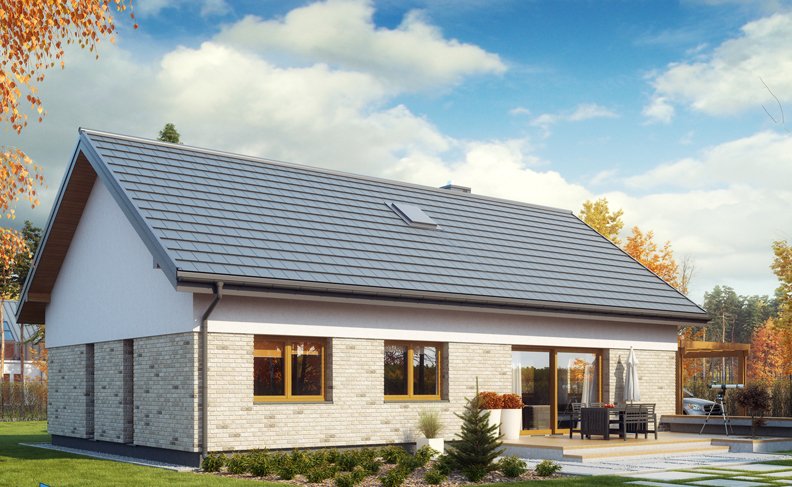 Wygodny dom o bryle łączącej tradycję z nowoczesnością. Funkcjonalnie rozplanowane wnętrze zapewnia komfortowe warunki mieszkania dla czteroosobowej rodziny. Dom posiada trzy sypialnie, wyposażone w szafy wnękowe, wygodną łazienkę, kuchnię oraz salon połączony z jadalnią i otwarty na ogród. Powiększona kotłownia pełni dodatkową funkcję pomieszczenia gospodarczego.