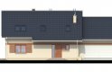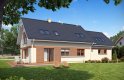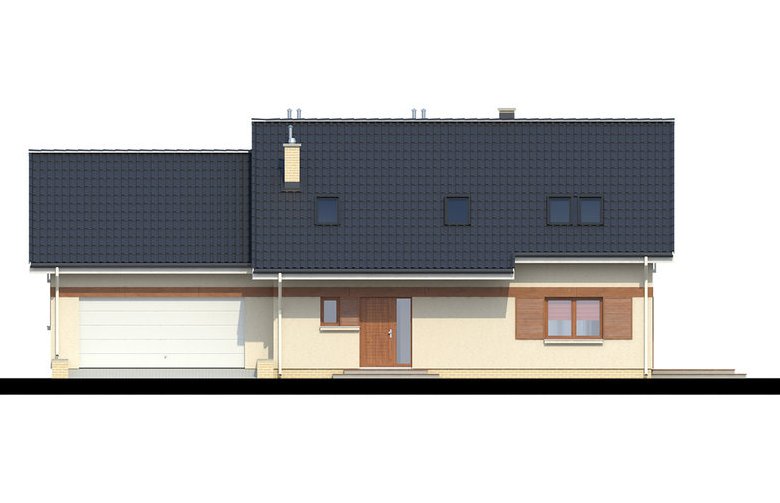 Dom o prostej, zwartej bryle z garażem dwustanowiskowym. Doskonały na działkę z wjazdem od południa jak również od północy. Ekonomiczny w budowie oraz późniejszym użytkowaniu. Niezwykle funkcjonalny. Na parterze wydzielono część dzienną z przestronnym salonem połączonym z jadalnią oraz dodatkowy pokój np. na gabinet, pokój gościnny. Część nocna na poddaszu mieści trzy sypialnie, dużą łazienkę oraz pokój dla domowników. Od strony ogrodu zaprojektowano taras. Całości uroku dodają drewniane elementy elewacji.