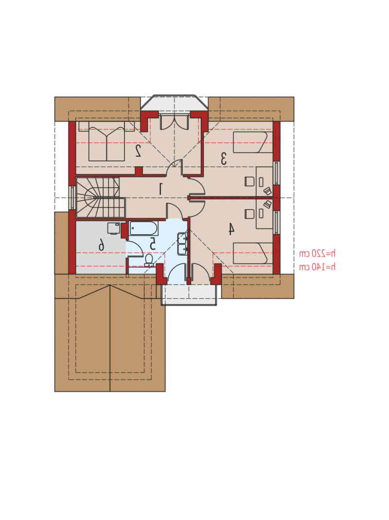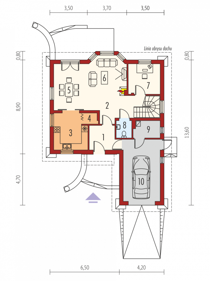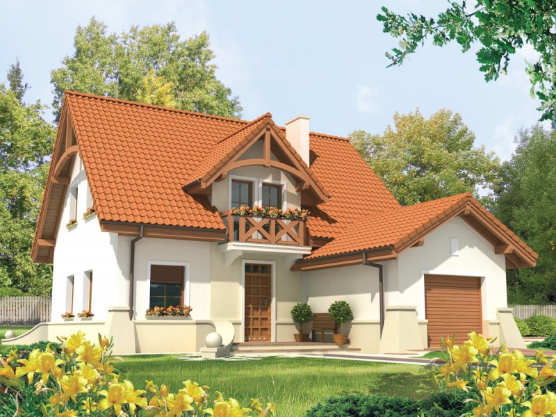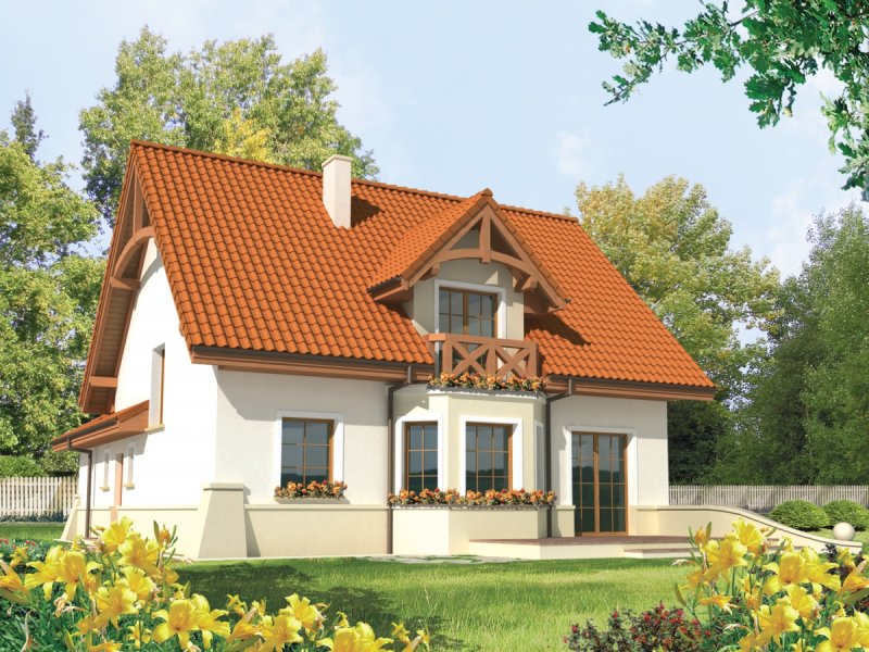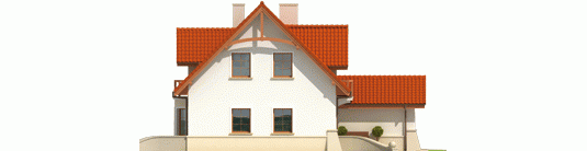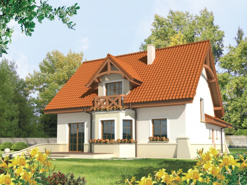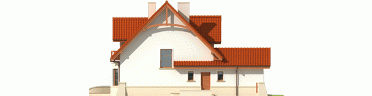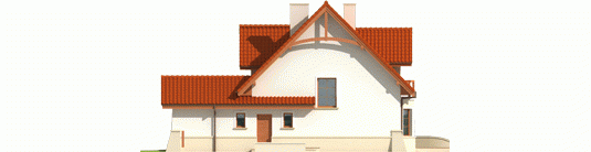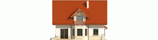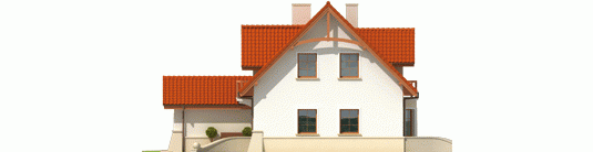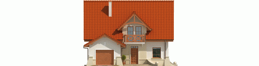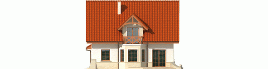 Dom parterowy z użytkowym poddaszem, niepodpiwniczony, z garażem jednostanowiskowym, przeznaczony dla 4-5-osobowej rodziny. Na strefę dzienną, znajdującą się na parterze składa się: przestronny salon z jadalnią, wygodna kuchnia ze spiżarnią, gabinet oraz łazienka, a także pomieszczenie gospodarcze dostępne z garażu. Na poddaszu zaplanowano strefę nocną: trzy pokoje, wygodną łazienkę oraz pralnię. Zaplanowany w projekcie wykusz podnosi walory użytkowe i estetyczne domu, a także dodaje atrakcyjności prostej bryle budynku.