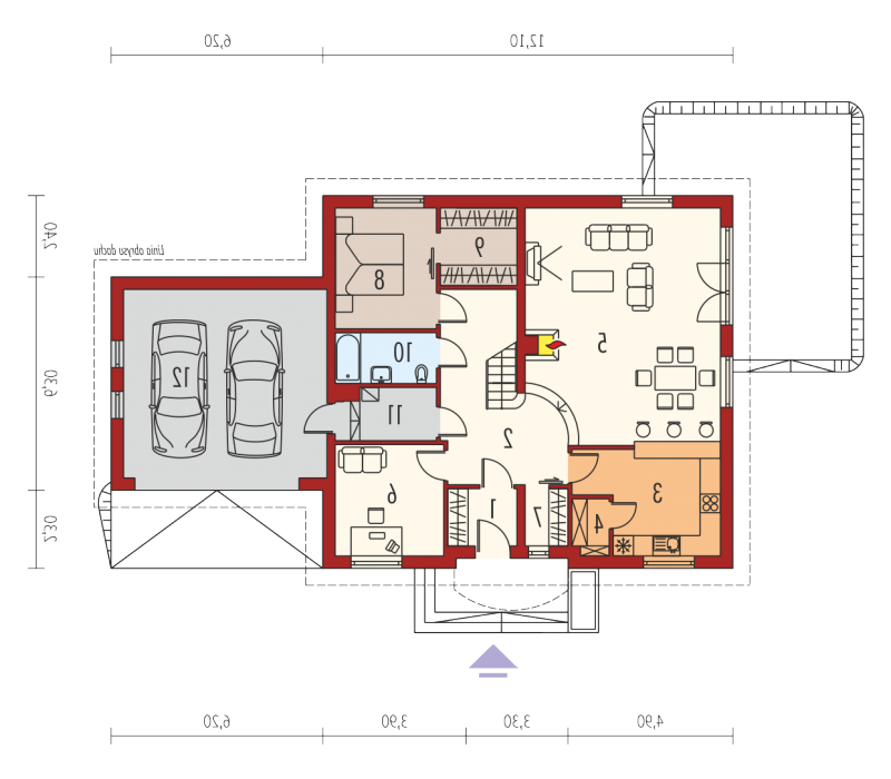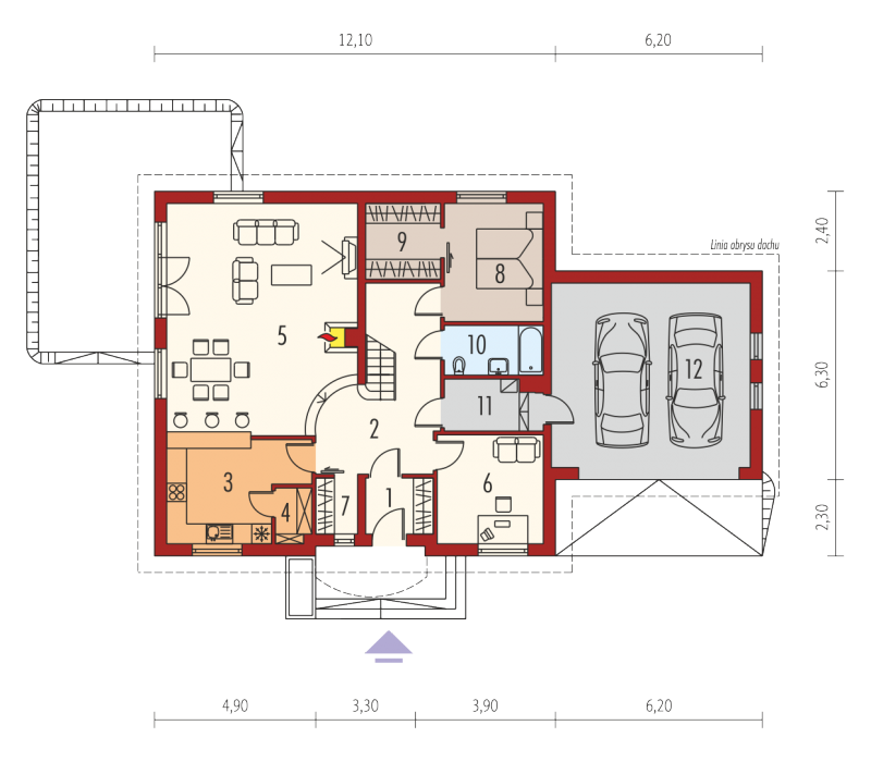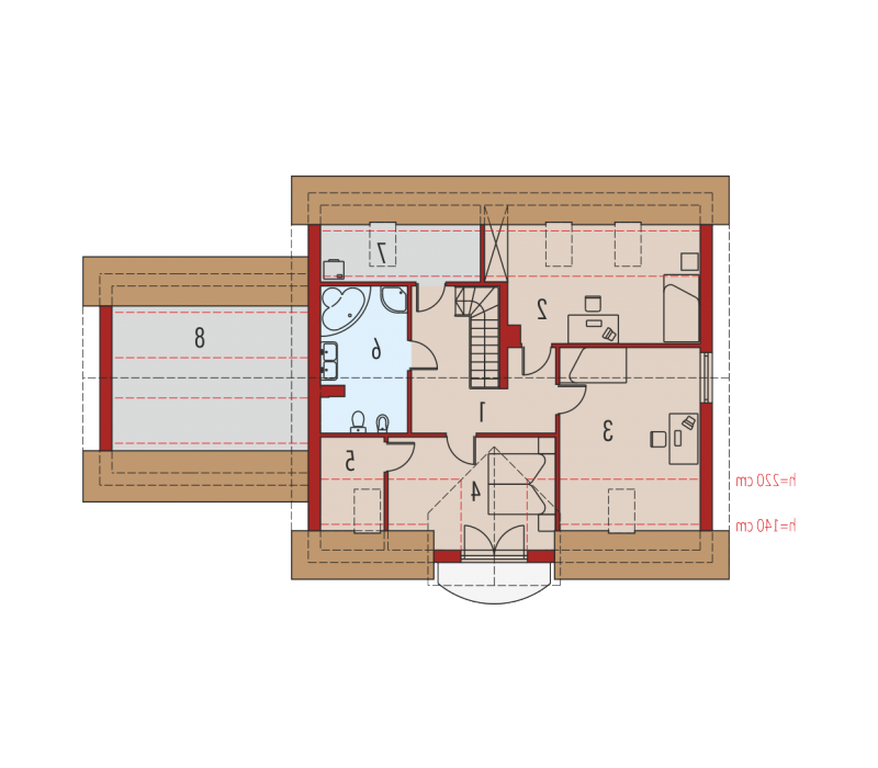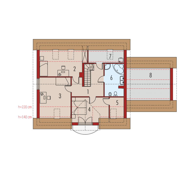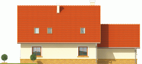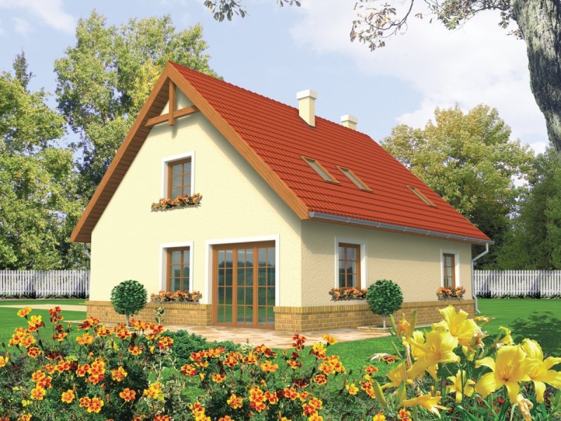 Dom parterowy z poddaszem użytkowym, niepodpiwniczony, przeznaczony dla 4-6-osobowej rodziny. Ma prostą, tradycyjną formę. Na parterze znajduje się strefa dzienna: salon połączony z jadalnią, kuchnia i spiżarnia oraz gabinet. Zaplanowano tu również sypialnię z garderobą i łazienką, która może służyć jako pokój gościnny lub – w przypadku domu dwupokoleniowego – jako sypialnia dziadków. Strefa nocna znajduje się na poddaszu i składa się dwóch pokoi, sypialni z garderobą, łazienki i pralni. Istnieje wersja domu z garażem jedno- i dwustanowiskowym.
