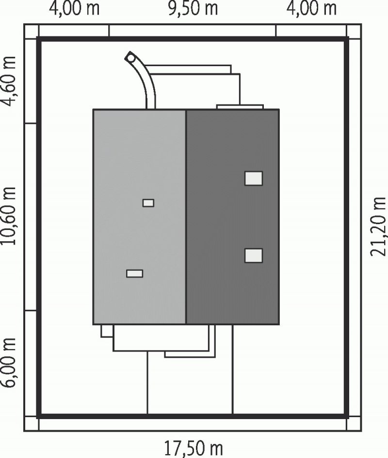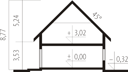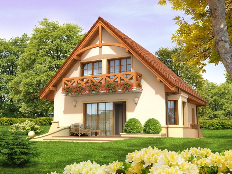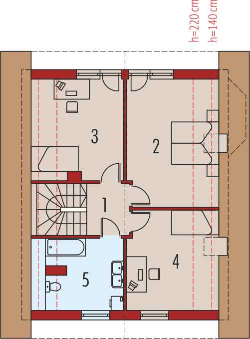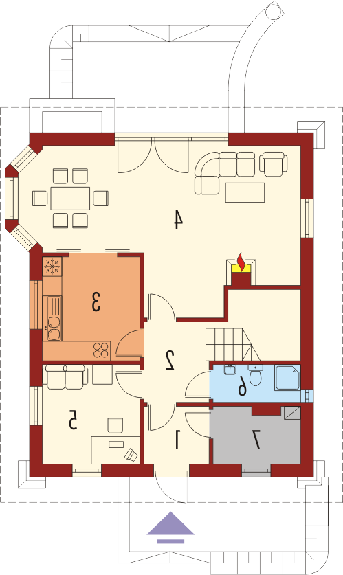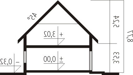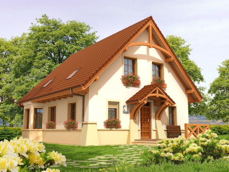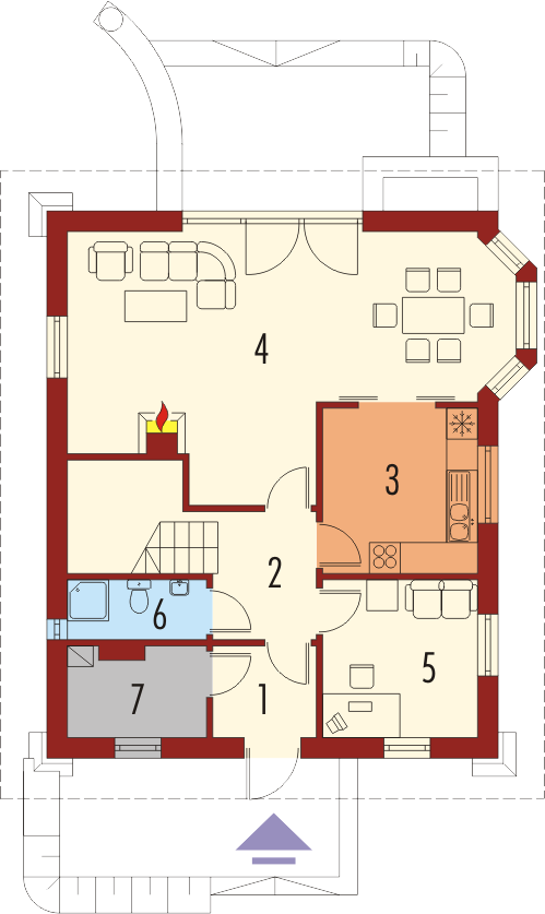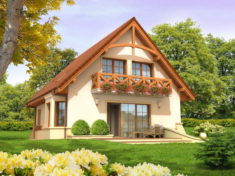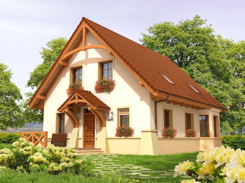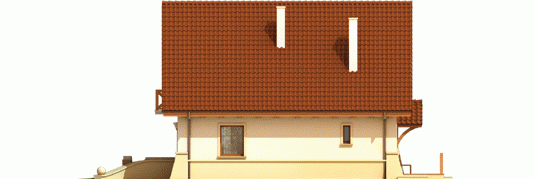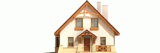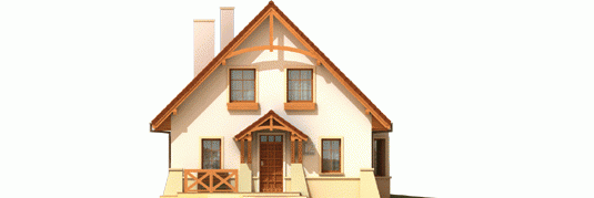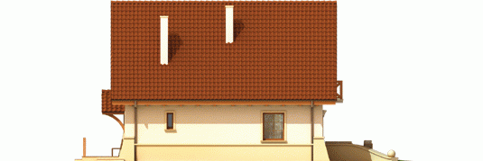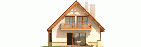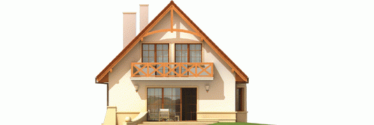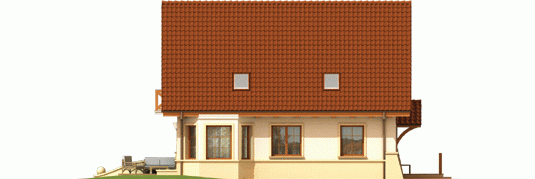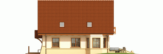 Dom parterowy z użytkowym poddaszem, niepodpiwniczony, przeznaczony dla 3-4-osobowej rodziny. Z holu, do którego dostajemy się bezpośrednio z wiatrołapu mamy dostęp do gabinetu, łazienki kuchni oraz schodów prowadzących na poddasze. Atrakcyjność przestronnego pokoju dziennego połączonego z wygodną i jasną jadalnią podnosi centralnie zaprojektowany kominek. Na poddaszu przewidziano dwa pokoje, wygodną sypialnie oraz przestronną łazienkę.