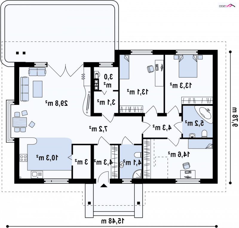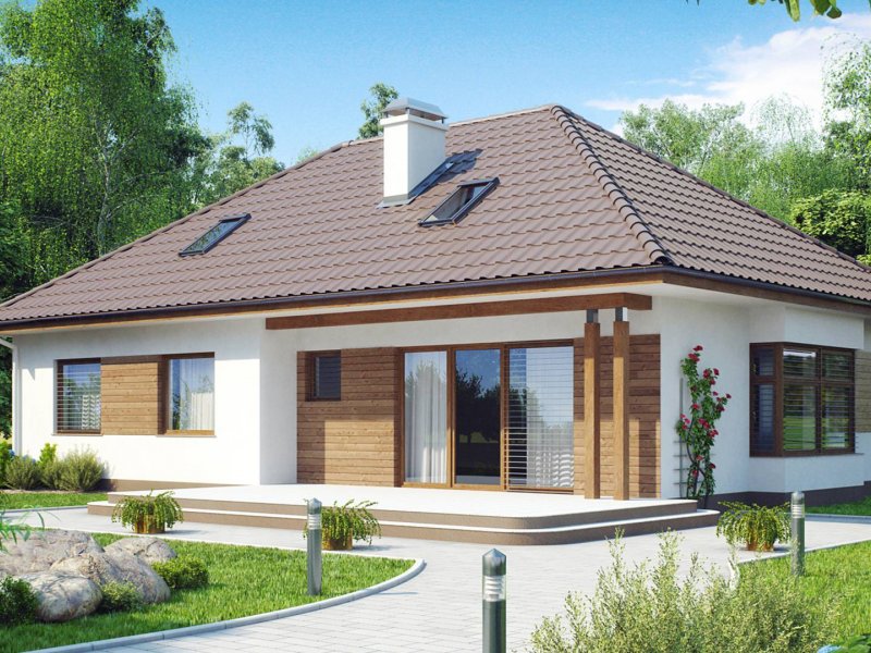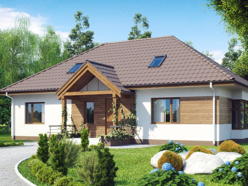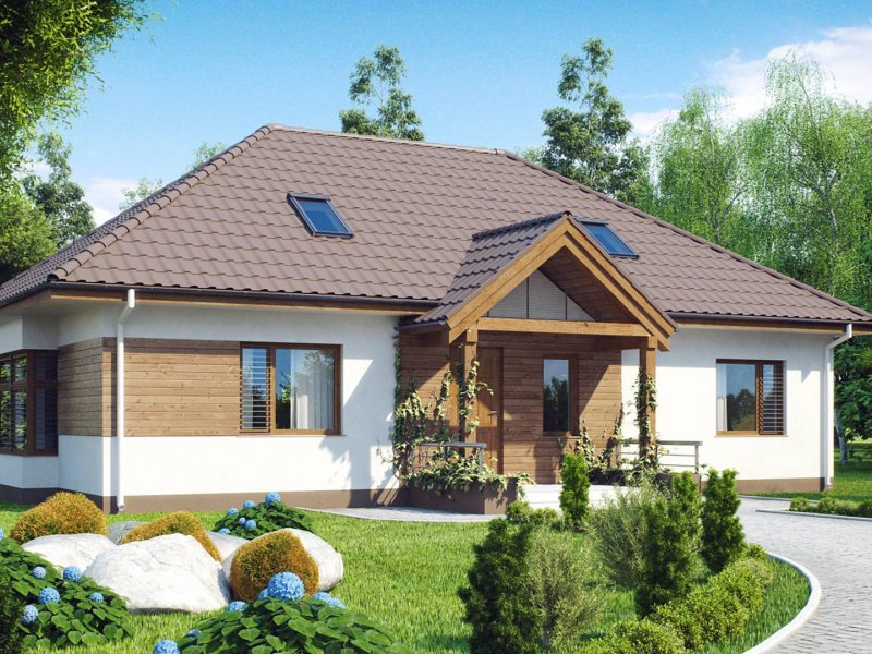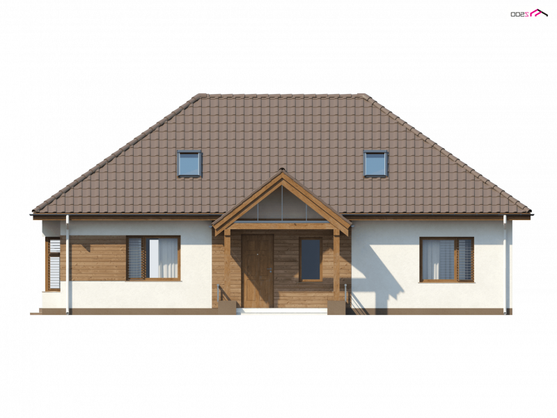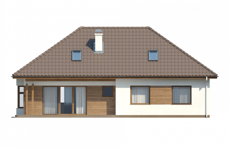 Z106 to projekt domu parterowego o estetycznym wyglądzie i komfortowym wnętrzu. Prosta, zgrabna bryła, wysunięty daszek na słupkach, wykończenie elewacji naturalnymi materiałami oraz kopertowy dach nadają mu stylu dawnych dworków szlacheckich.