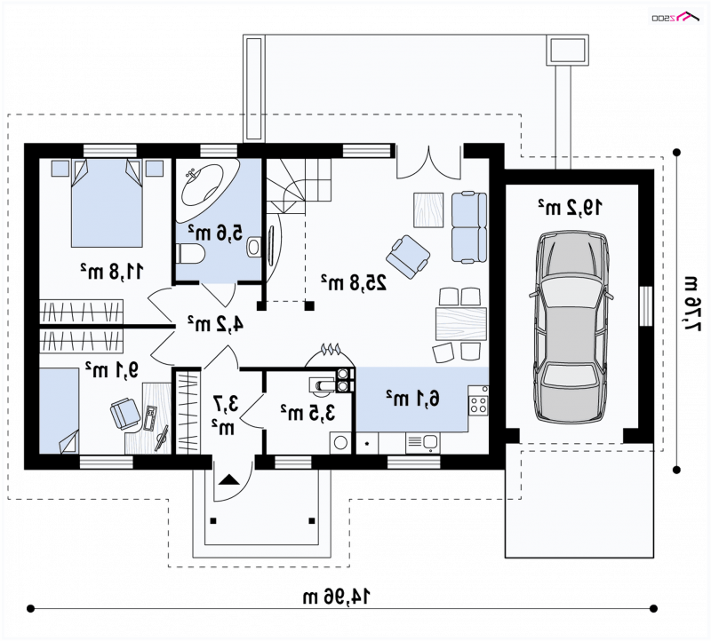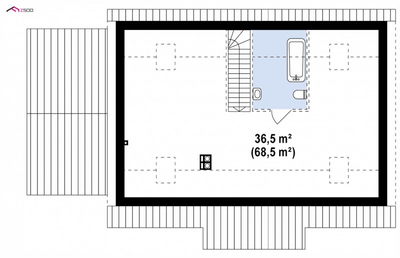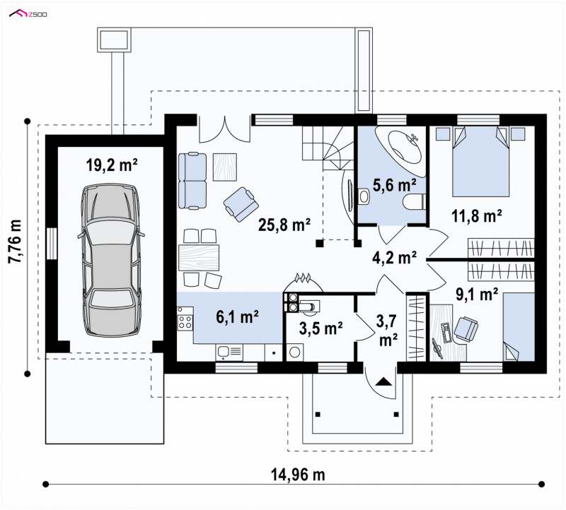 Z12 GL to zgrabny dom parterowy z opcją zagospodarowania poddasza. Prosta bryła oraz możliwością etapowania inwestycji czynią go tanią i ekonomiczną inwestycją. Konstrukcja oparta na ścianach zewnętrznych pozwala na dowolne kształtowanie wnętrza ściankami działowymi.